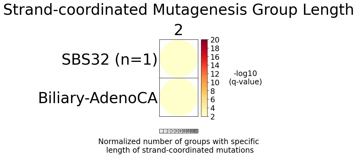 Strand-coordinated mutagenesis analysis identifies groups of consecutive single-base substitutions on the same DNA strand with the same pyrimidine mutation context (e.g., consecutive C>A, C>A, C>A) attributed to the same mutational signature within a sample.