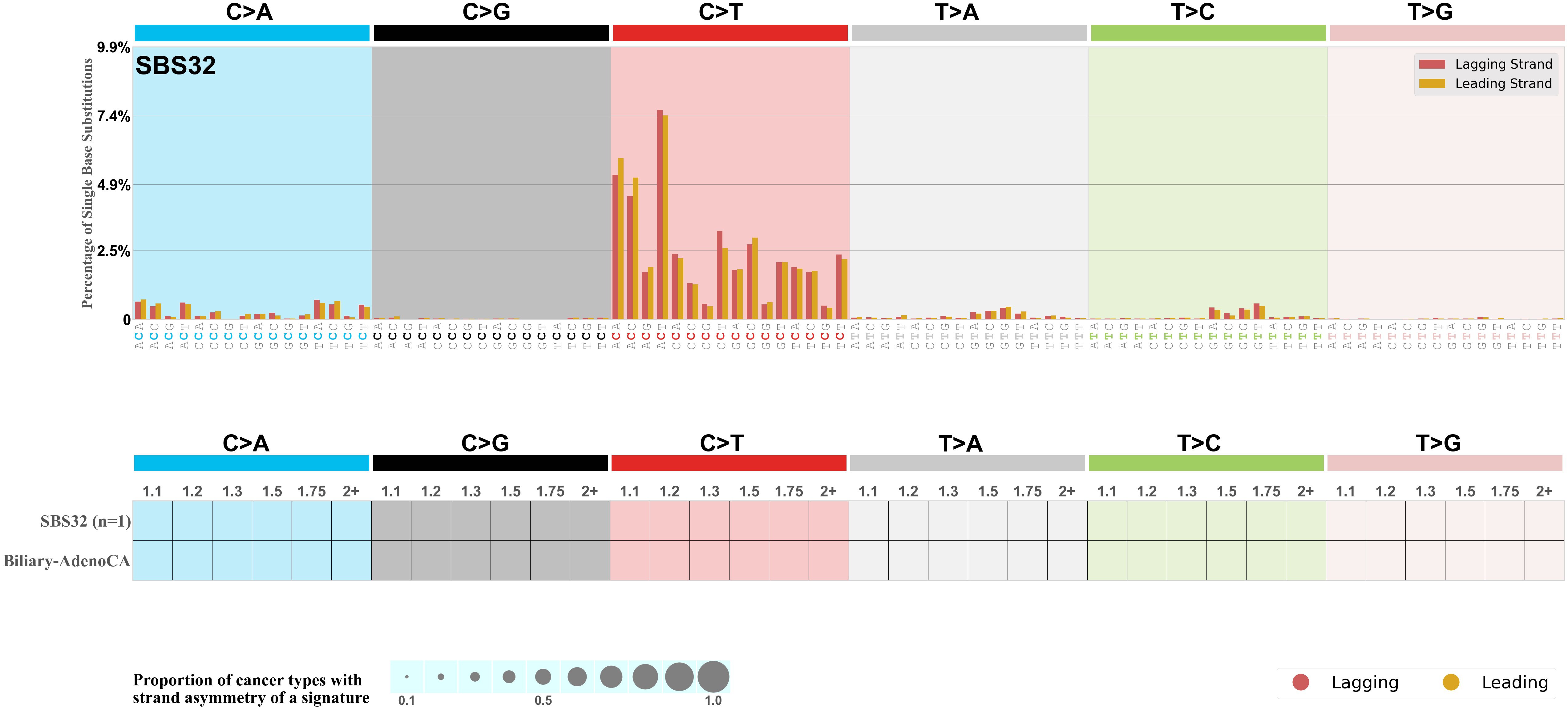 Each mutation attributed to the mutational signature is annotated as either on the lagging strand or the leading strand.