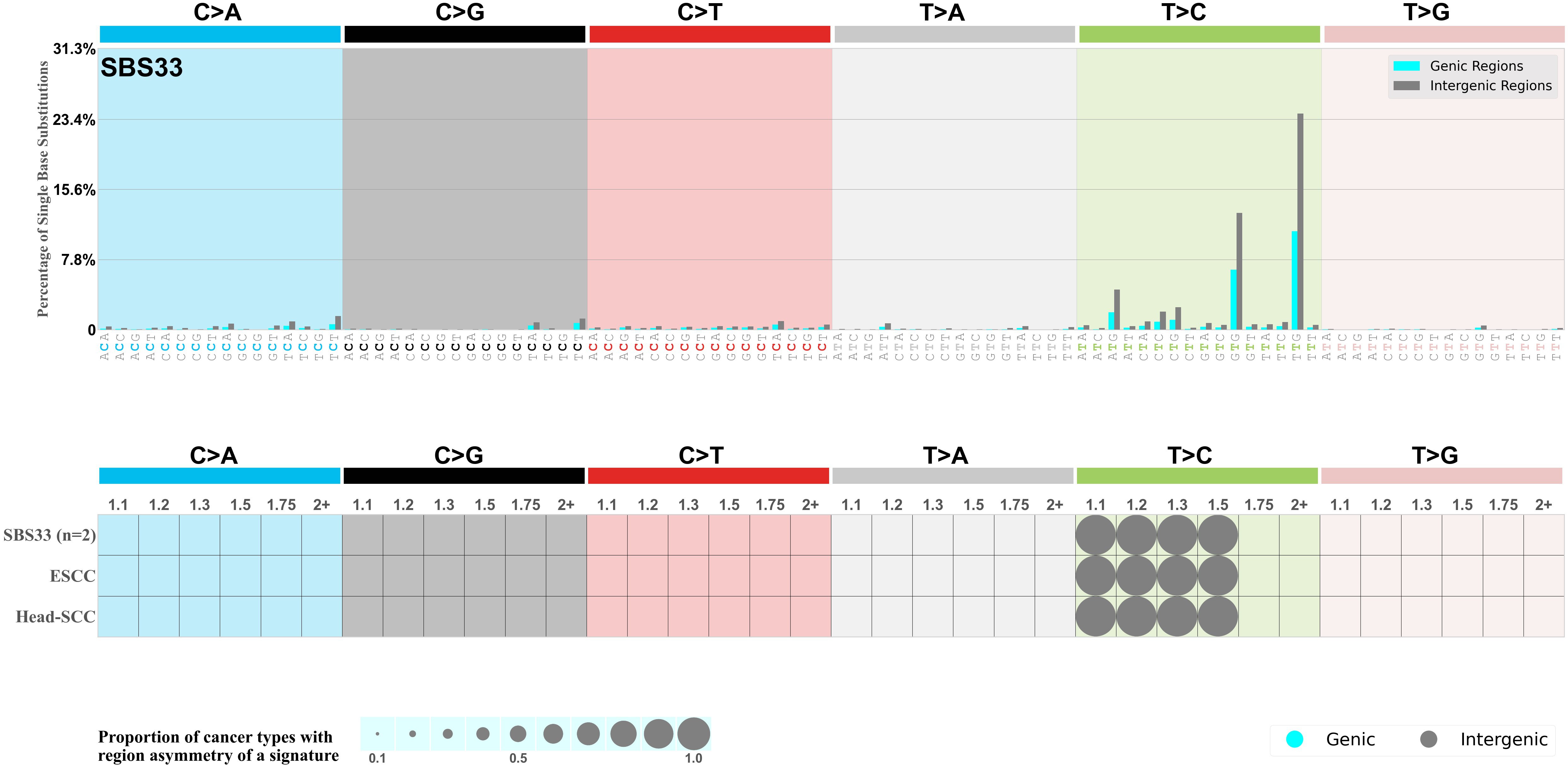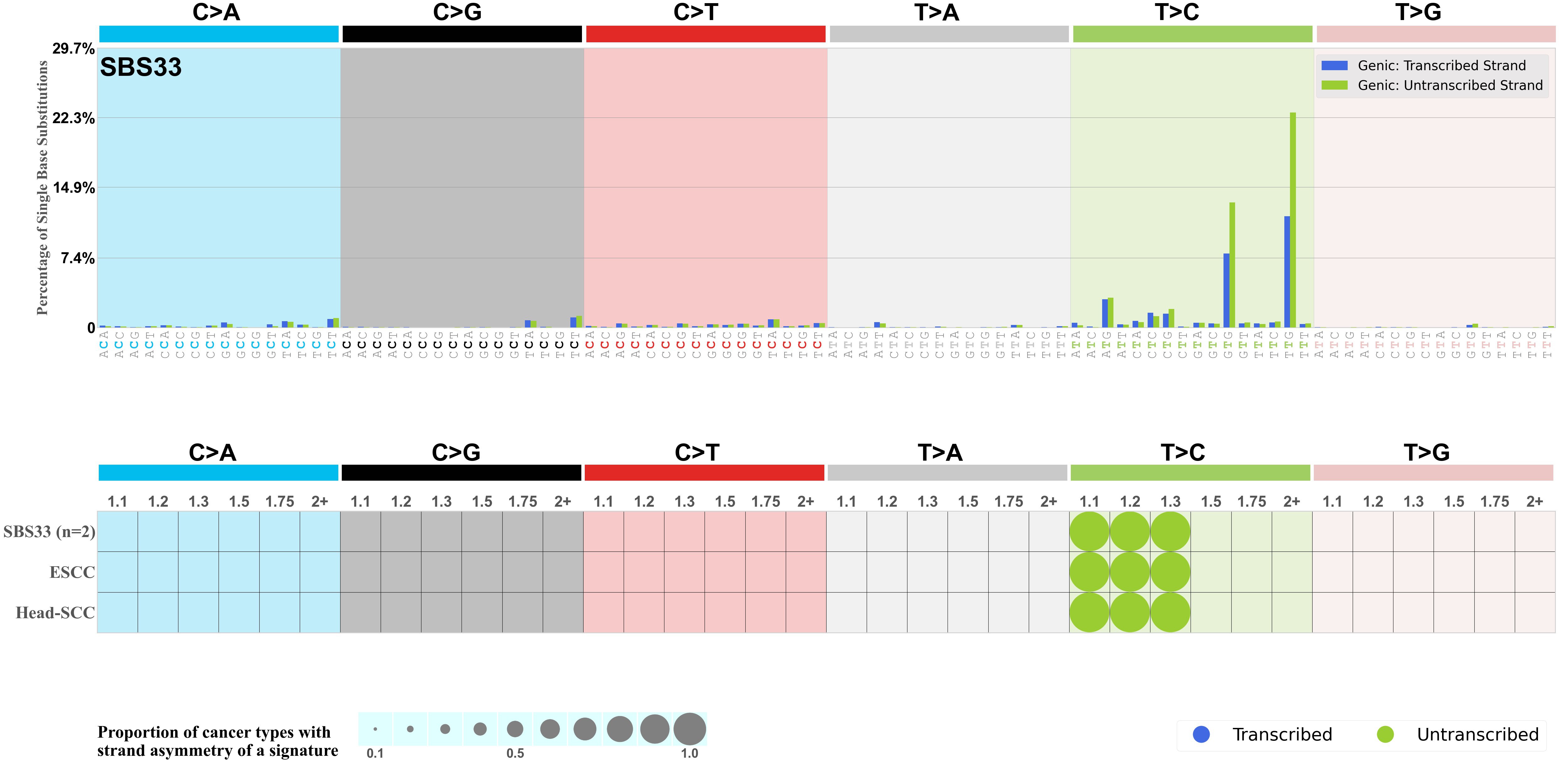 Mutational signatures exhibit asymmetric number of mutations due to either one of the DNA strands being preferentially repaired or one of the DNA strands having a higher propensity for being damaged. One common example of strand asymmetry is transcription-strand asymmetry which can be due to the activity of transcription-coupled nucleotide excision repair (TC-NER) or transcription-coupled damage amongst others.