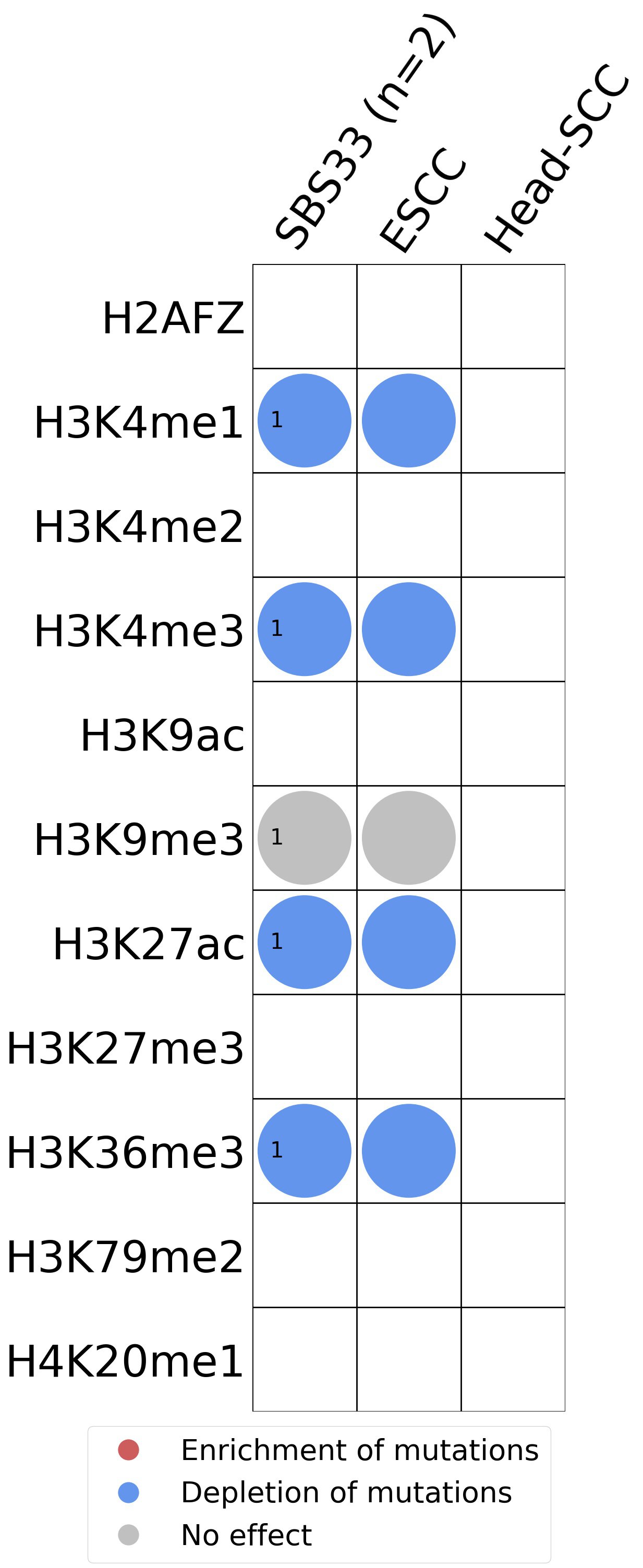 This plot shows the associations between mutational signatures and histone marks. Pie charts display the number of cancer types that are either enriched, depleted, or have no statistical effect for a given mutational signature and a specific histone mark. Differential changes are calculated by statistically comparing the of average signals between real and simulated mutations using a 100 base window centered at the somatic mutation. Enrichments reflect at least 5% statistically significant increases in real signal when compared to simulated signal. Depletions reflect at least 5% statistically significant decreases in real signal when compared to simulated signal. Statistical significance is determined based on false-discovery rate corrected p-value below 0.05.