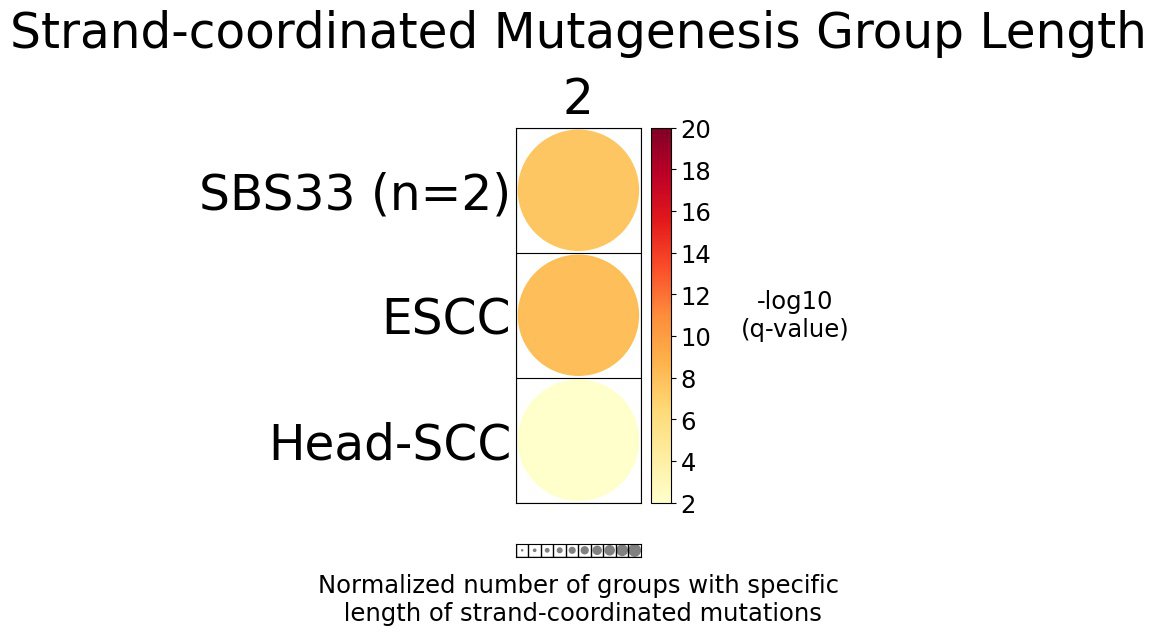 Strand-coordinated mutagenesis analysis identifies groups of consecutive single-base substitutions on the same DNA strand with the same pyrimidine mutation context (e.g., consecutive C>A, C>A, C>A) attributed to the same mutational signature within a sample.