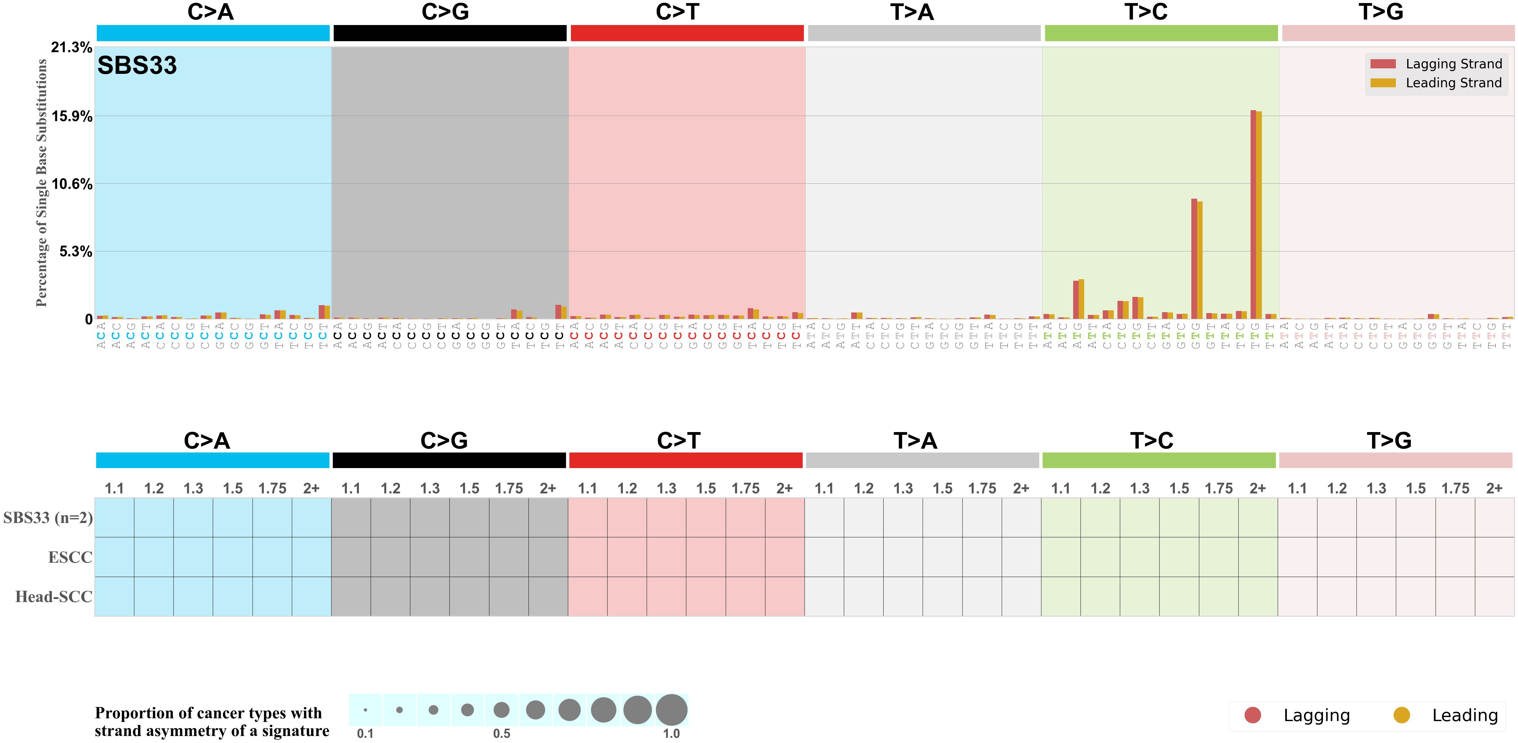 Each mutation attributed to the mutational signature is annotated as either on the lagging strand or the leading strand.