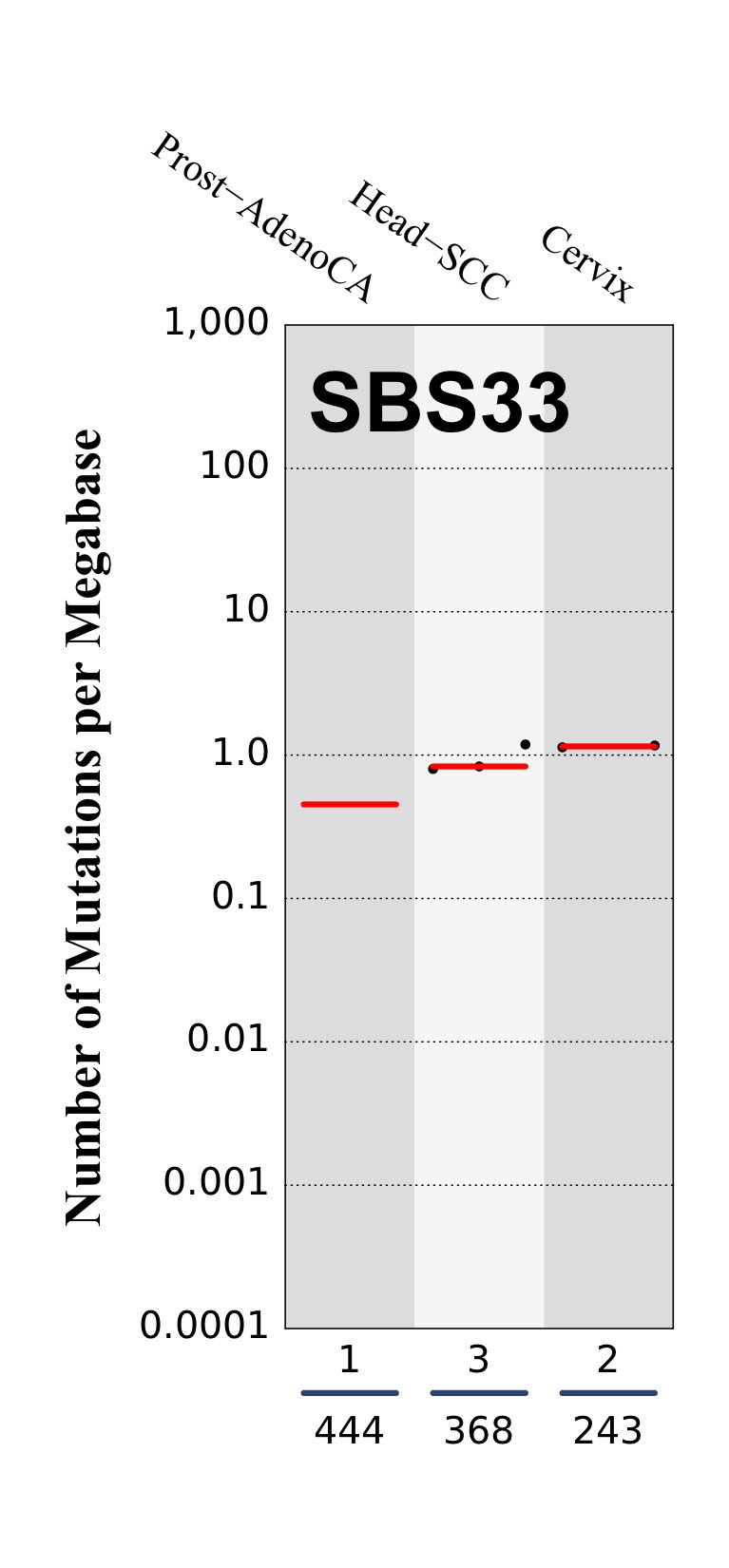 Numbers of mutations per megabase attributed to the mutational signature across the cancer types in which the signature was found. Each dot represents an individual sample and only samples where the signature is found are shown. The number of mutations per megabase was calculated by assuming that an average whole-exome has 30 Mb with sufficient coverage, whereas an average whole-genome has 2,800 Mb with sufficient coverage.