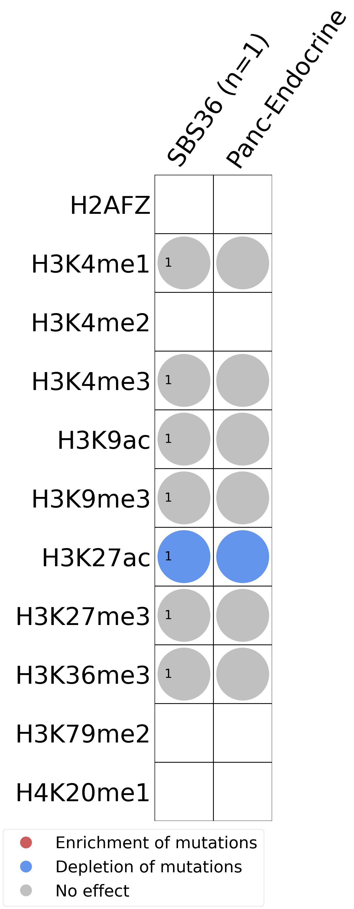 This plot shows the associations between mutational signatures and histone marks. Pie charts display the number of cancer types that are either enriched, depleted, or have no statistical effect for a given mutational signature and a specific histone mark. Differential changes are calculated by statistically comparing the of average signals between real and simulated mutations using a 100 base window centered at the somatic mutation. Enrichments reflect at least 5% statistically significant increases in real signal when compared to simulated signal. Depletions reflect at least 5% statistically significant decreases in real signal when compared to simulated signal. Statistical significance is determined based on false-discovery rate corrected p-value below 0.05.