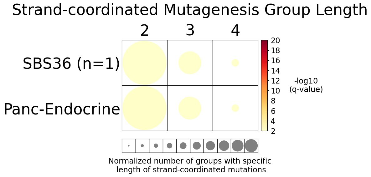Strand-coordinated mutagenesis analysis identifies groups of consecutive single-base substitutions on the same DNA strand with the same pyrimidine mutation context (e.g., consecutive C>A, C>A, C>A) attributed to the same mutational signature within a sample.