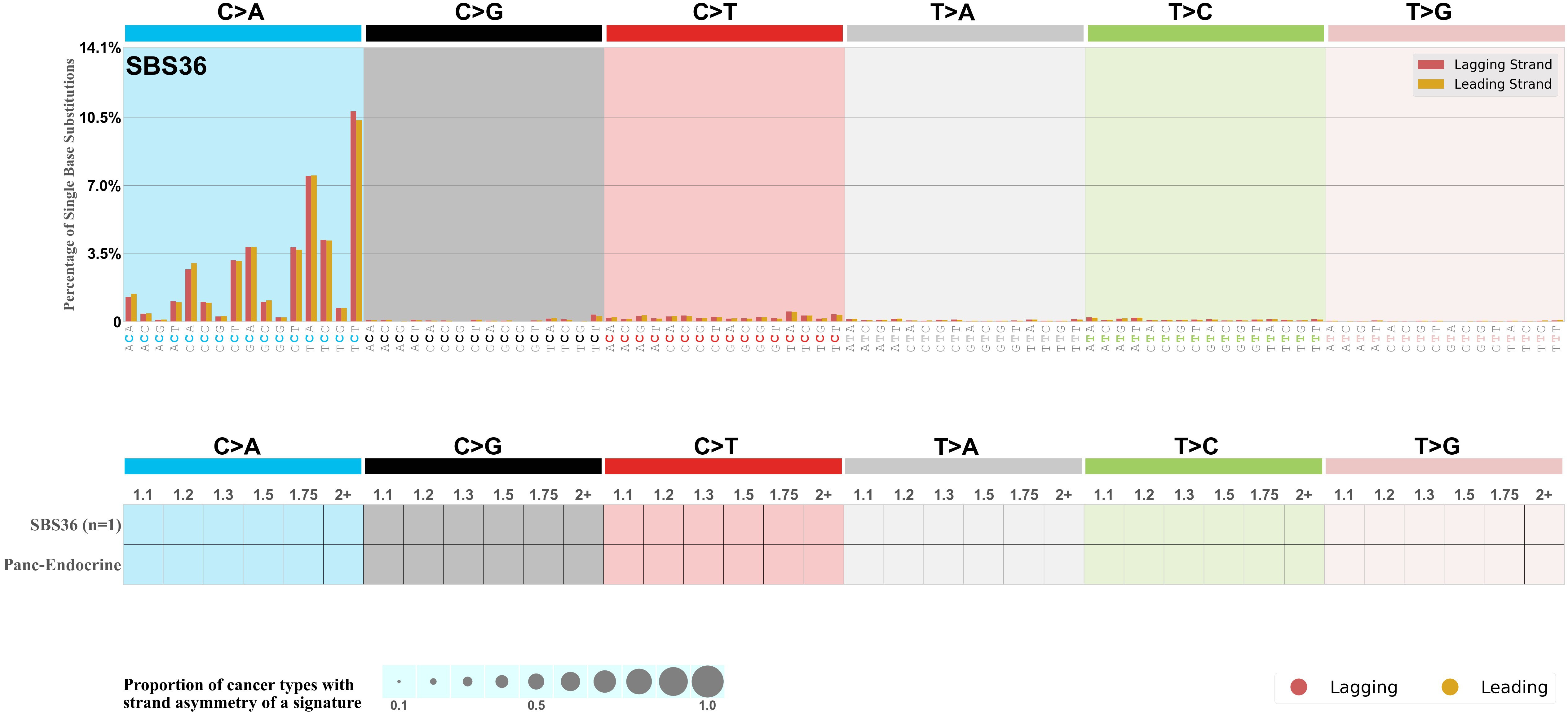 Each mutation attributed to the mutational signature is annotated as either on the lagging strand or the leading strand.