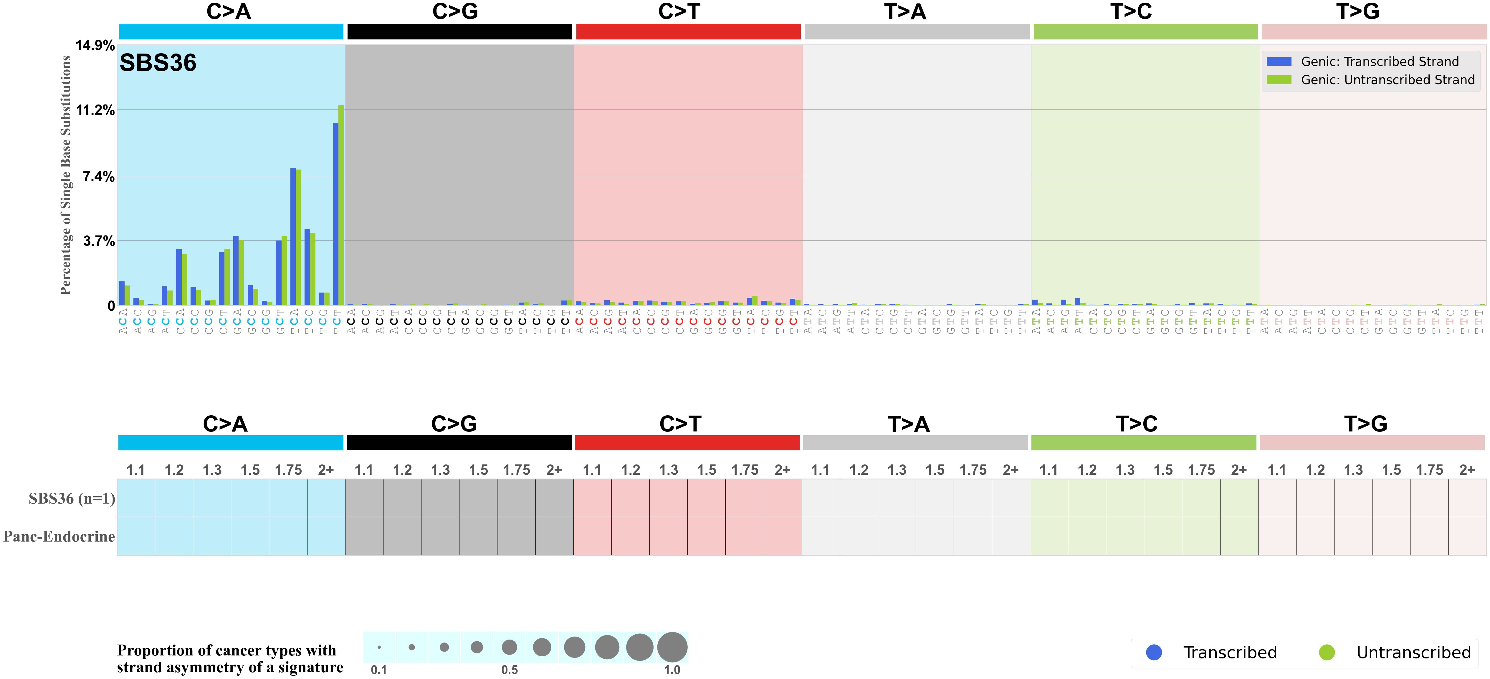 Each mutation attributed to the mutational signature is annotated as either on the transcribed strand, untranscribed strand, or non-transcribed strand.
