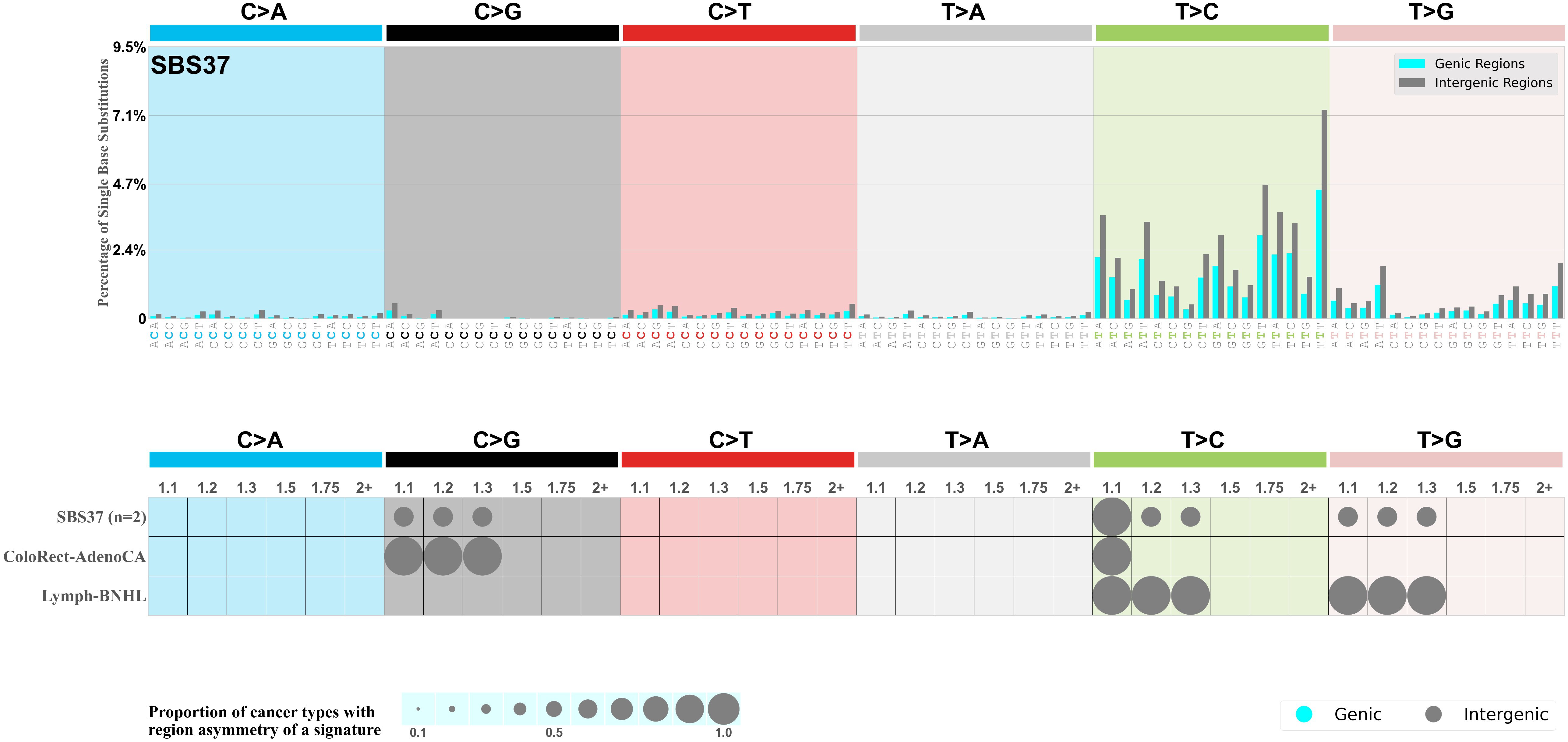 In the lower circle plot, the circles are filled with the colour of the significant region when there is an odds ratio of at least 1.1 with statistical significance. The first row of this plot displays the genic versus intergenic region asymmetry across all cancer types, while the remaining rows present genic versus intergenic region asymmetry for each cancer type.