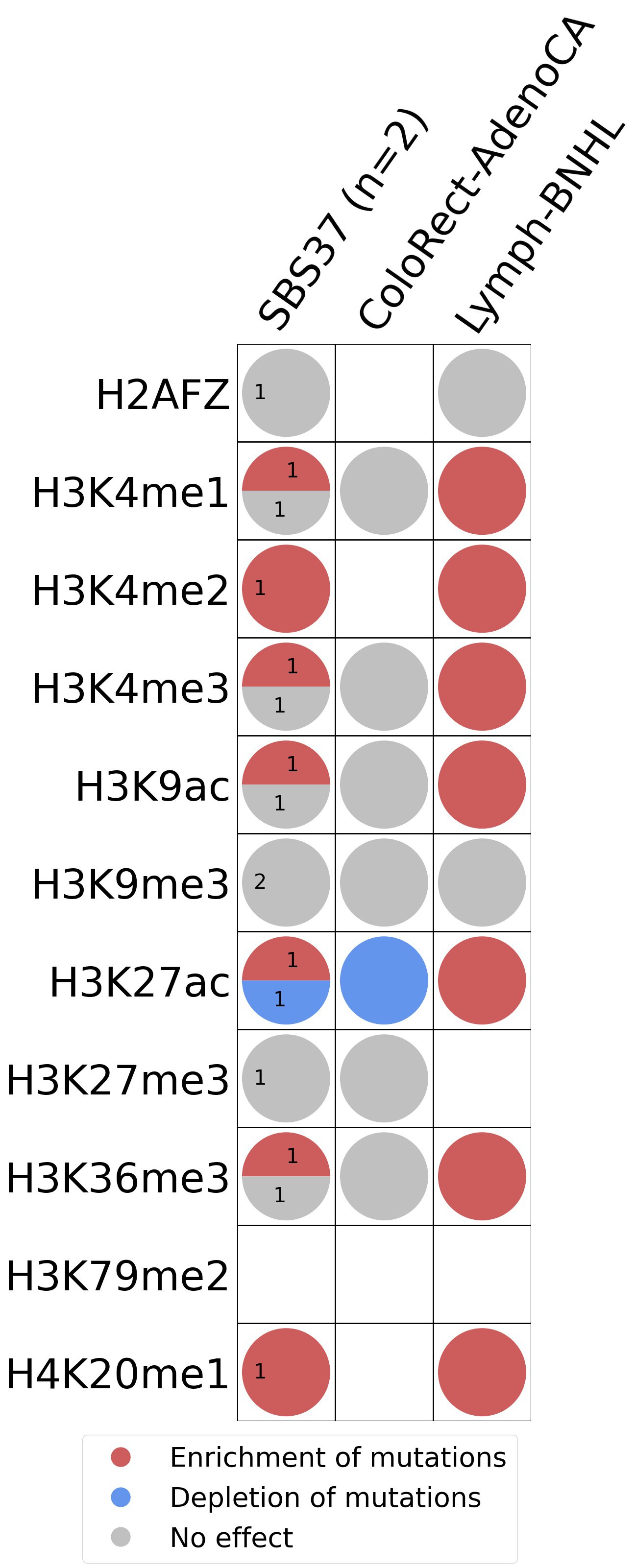 This plot shows the associations between mutational signatures and histone marks. Pie charts display the number of cancer types that are either enriched, depleted, or have no statistical effect for a given mutational signature and a specific histone mark. Differential changes are calculated by statistically comparing the of average signals between real and simulated mutations using a 100 base window centered at the somatic mutation. Enrichments reflect at least 5% statistically significant increases in real signal when compared to simulated signal. Depletions reflect at least 5% statistically significant decreases in real signal when compared to simulated signal. Statistical significance is determined based on false-discovery rate corrected p-value below 0.05.