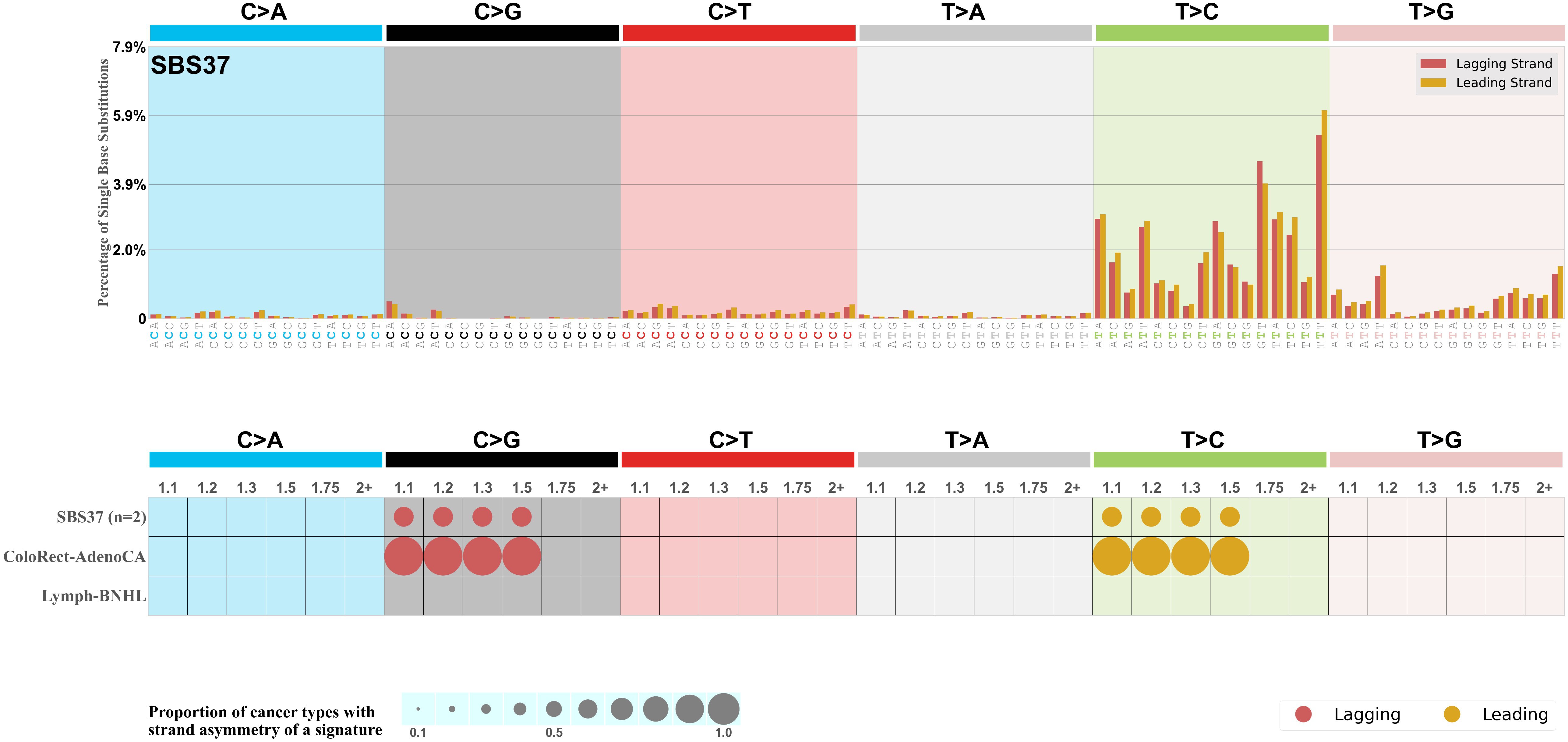 Each mutation attributed to the mutational signature is annotated as either on the lagging strand or the leading strand.