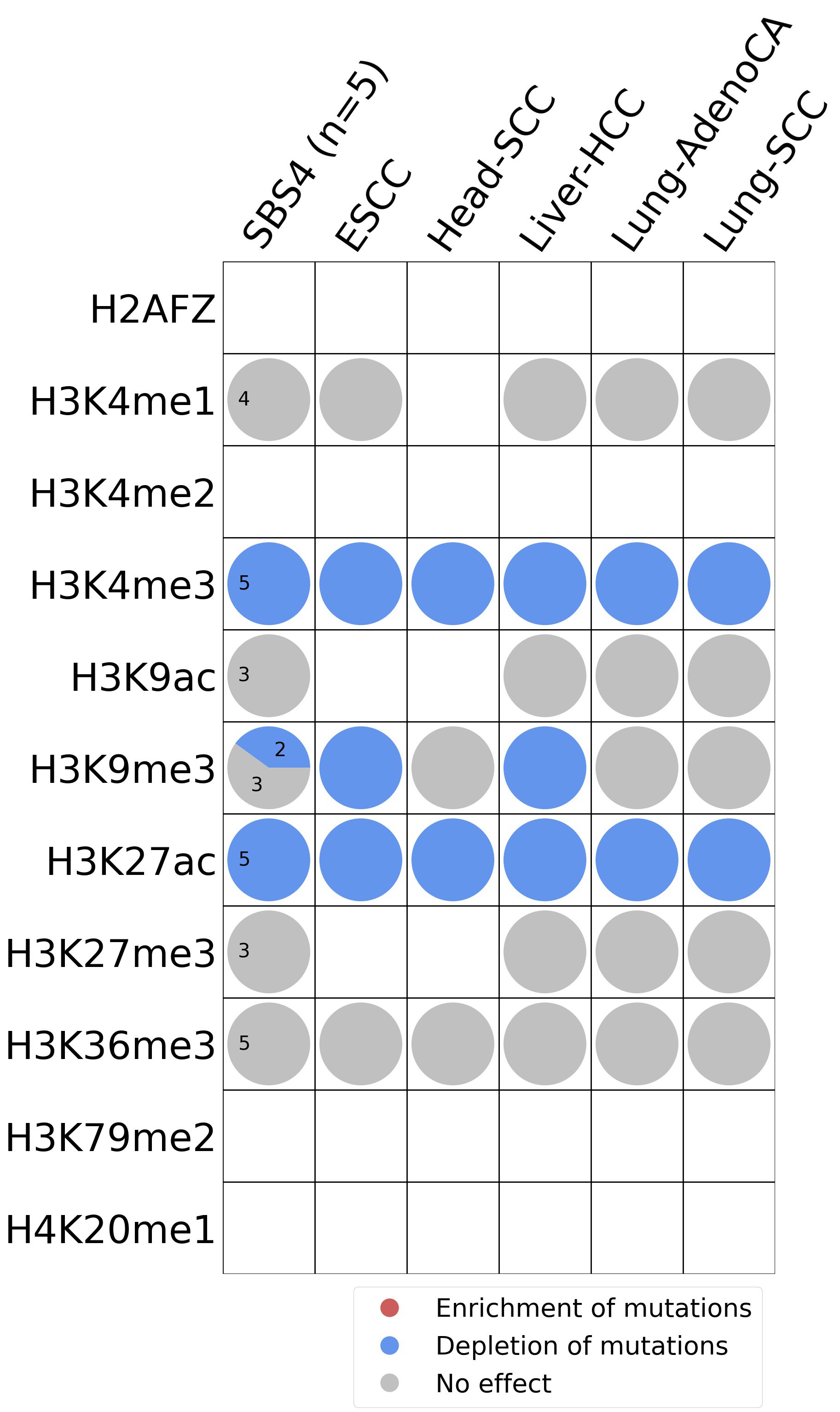 This plot shows the associations between mutational signatures and histone marks. Pie charts display the number of cancer types that are either enriched, depleted, or have no statistical effect for a given mutational signature and a specific histone mark. Differential changes are calculated by statistically comparing the of average signals between real and simulated mutations using a 100 base window centered at the somatic mutation. Enrichments reflect at least 5% statistically significant increases in real signal when compared to simulated signal. Depletions reflect at least 5% statistically significant decreases in real signal when compared to simulated signal. Statistical significance is determined based on false-discovery rate corrected p-value below 0.05.