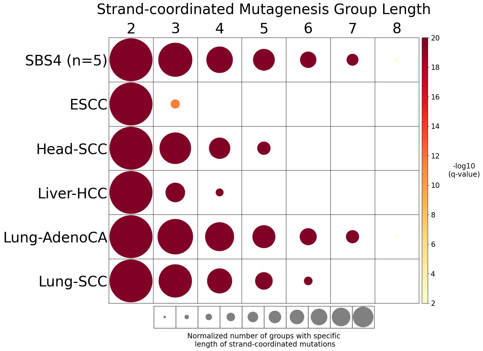 Strand-coordinated mutagenesis analysis identifies groups of consecutive single-base substitutions on the same DNA strand with the same pyrimidine mutation context (e.g., consecutive C>A, C>A, C>A) attributed to the same mutational signature within a sample.
