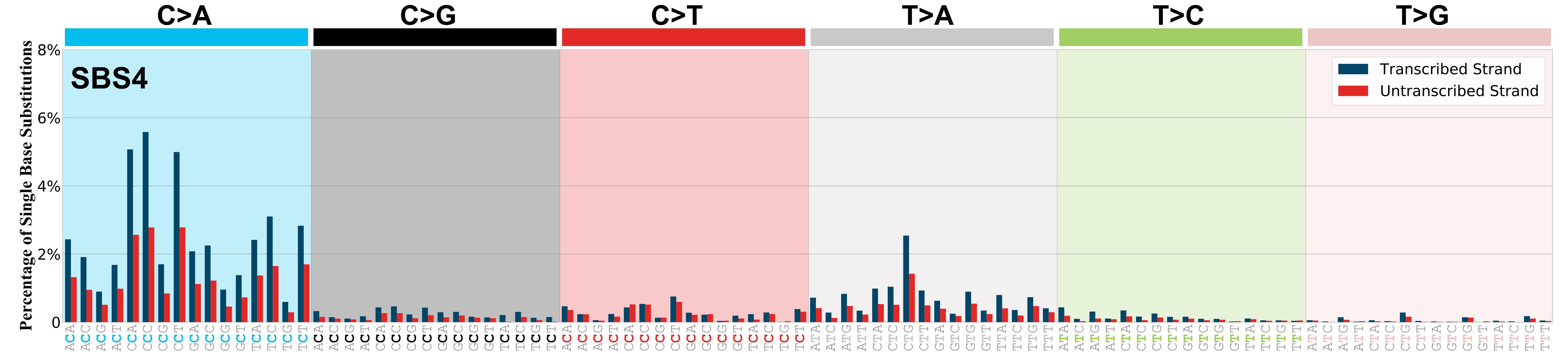 Associated with tobacco smoking. Its profile is similar to the mutational spectrum observed in experimental systems exposed to tobacco carcinogens such as benzo[a]pyrene. SBS4 is, therefore, likely due to direct DNA damage by tobacco smoke mutagens.