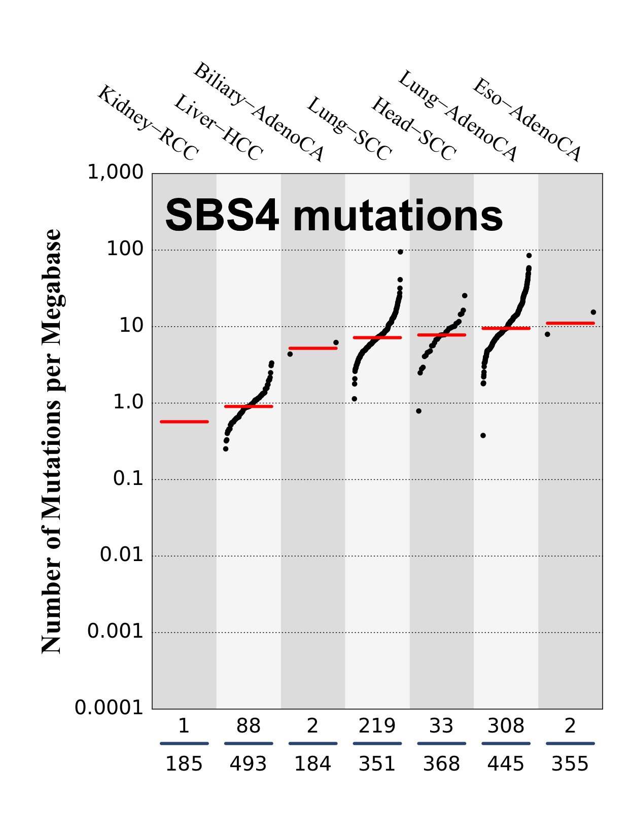 Although tobacco smoking causes multiple cancer types in addition to lung and head and neck, SBS4 has not been detected in many of these. SBS29 is found in cancers associated with tobacco chewing and appears different from SBS4.