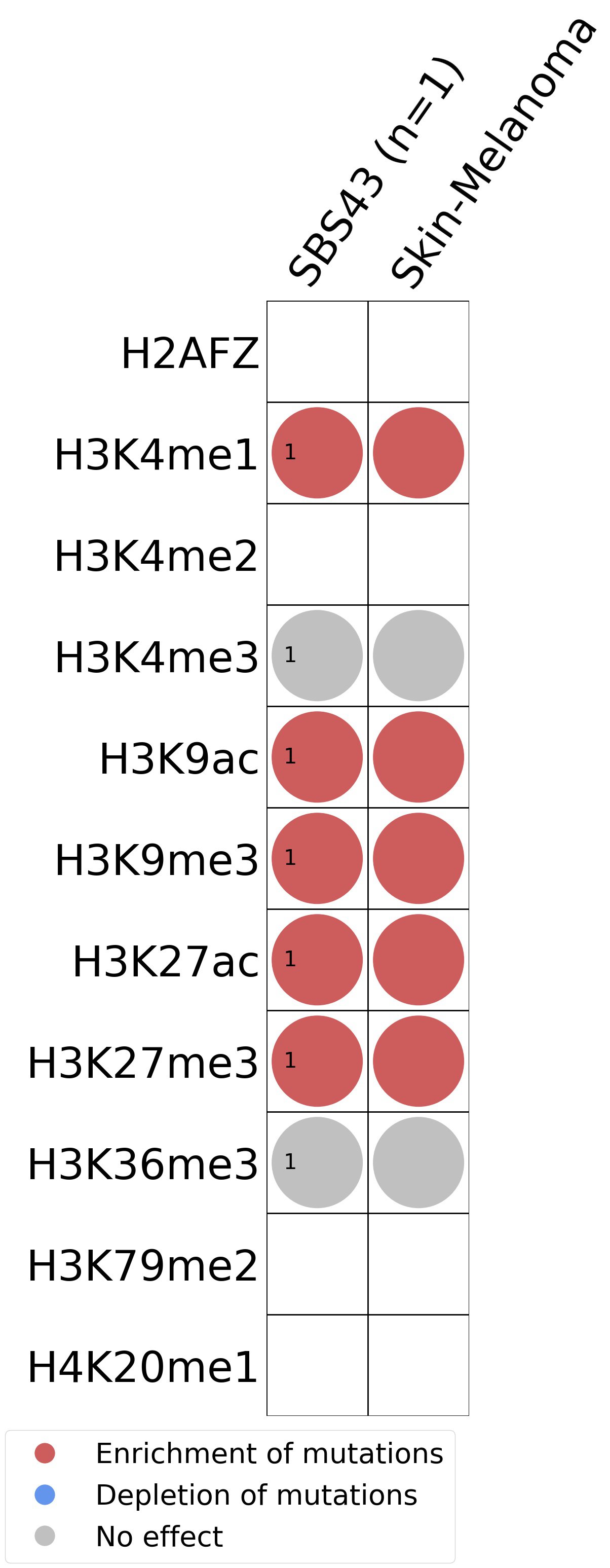 This plot shows the associations between mutational signatures and histone marks. Pie charts display the number of cancer types that are either enriched, depleted, or have no statistical effect for a given mutational signature and a specific histone mark. Differential changes are calculated by statistically comparing the of average signals between real and simulated mutations using a 100 base window centered at the somatic mutation. Enrichments reflect at least 5% statistically significant increases in real signal when compared to simulated signal. Depletions reflect at least 5% statistically significant decreases in real signal when compared to simulated signal. Statistical significance is determined based on false-discovery rate corrected p-value below 0.05.
