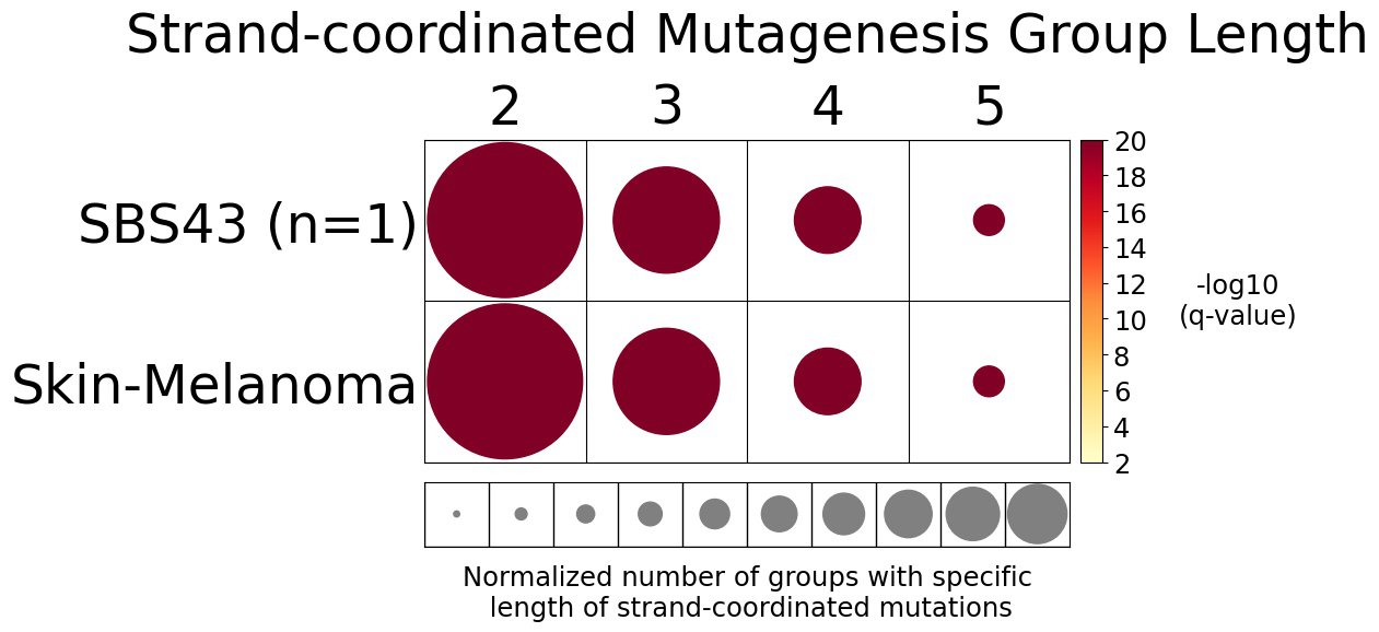 Strand-coordinated mutagenesis analysis identifies groups of consecutive single-base substitutions on the same DNA strand with the same pyrimidine mutation context (e.g., consecutive C>A, C>A, C>A) attributed to the same mutational signature within a sample.