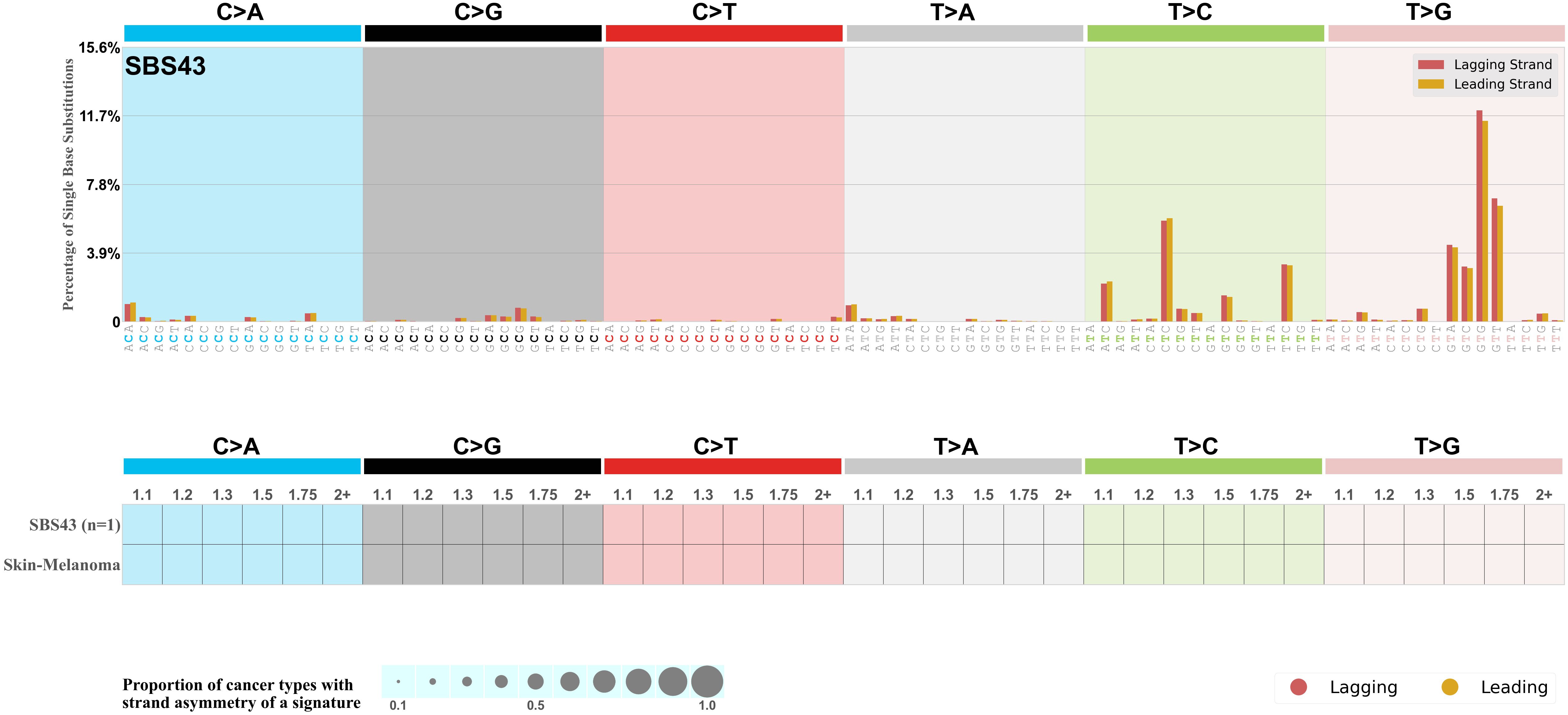 Each mutation attributed to the mutational signature is annotated as either on the lagging strand or the leading strand.