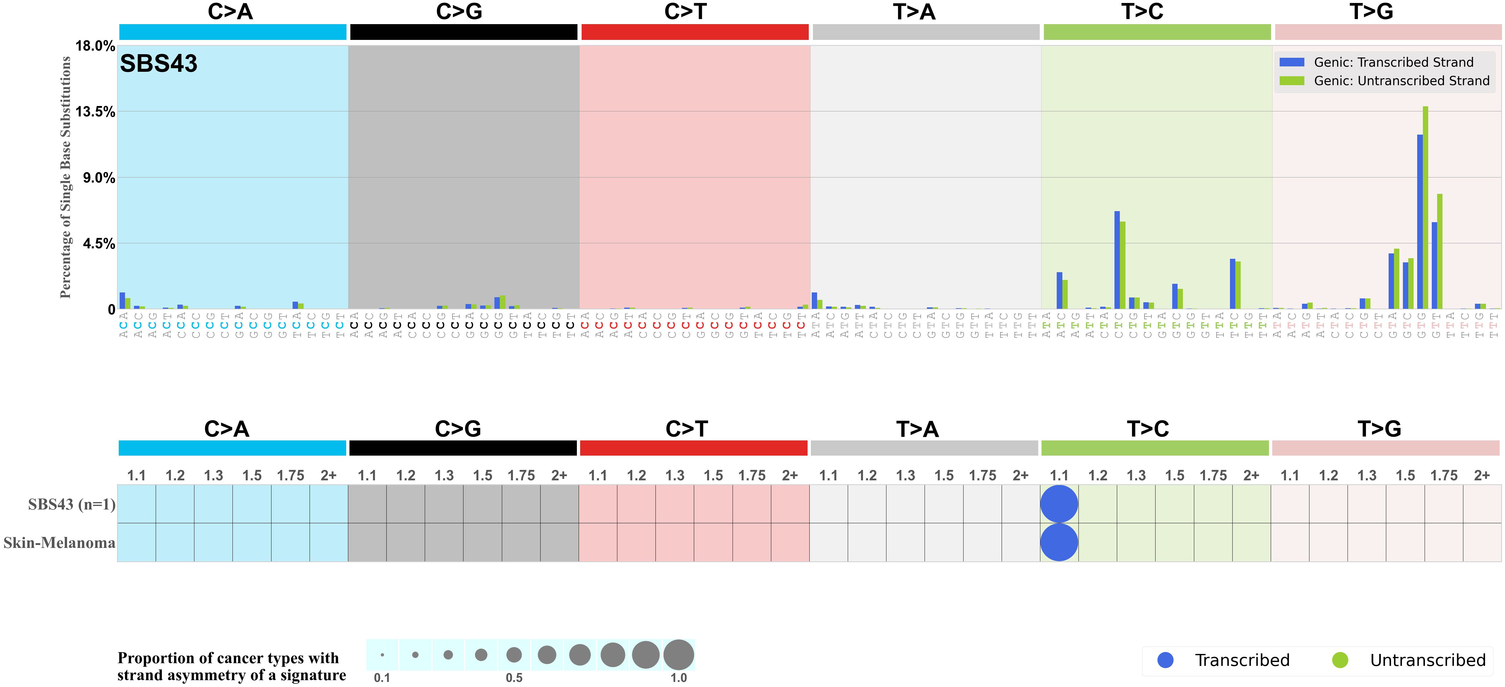Mutational signatures exhibit asymmetric number of mutations due to either one of the DNA strands being preferentially repaired or one of the DNA strands having a higher propensity for being damaged. One common example of strand asymmetry is transcription-strand asymmetry which can be due to the activity of transcription-coupled nucleotide excision repair (TC-NER) or transcription-coupled damage amongst others.