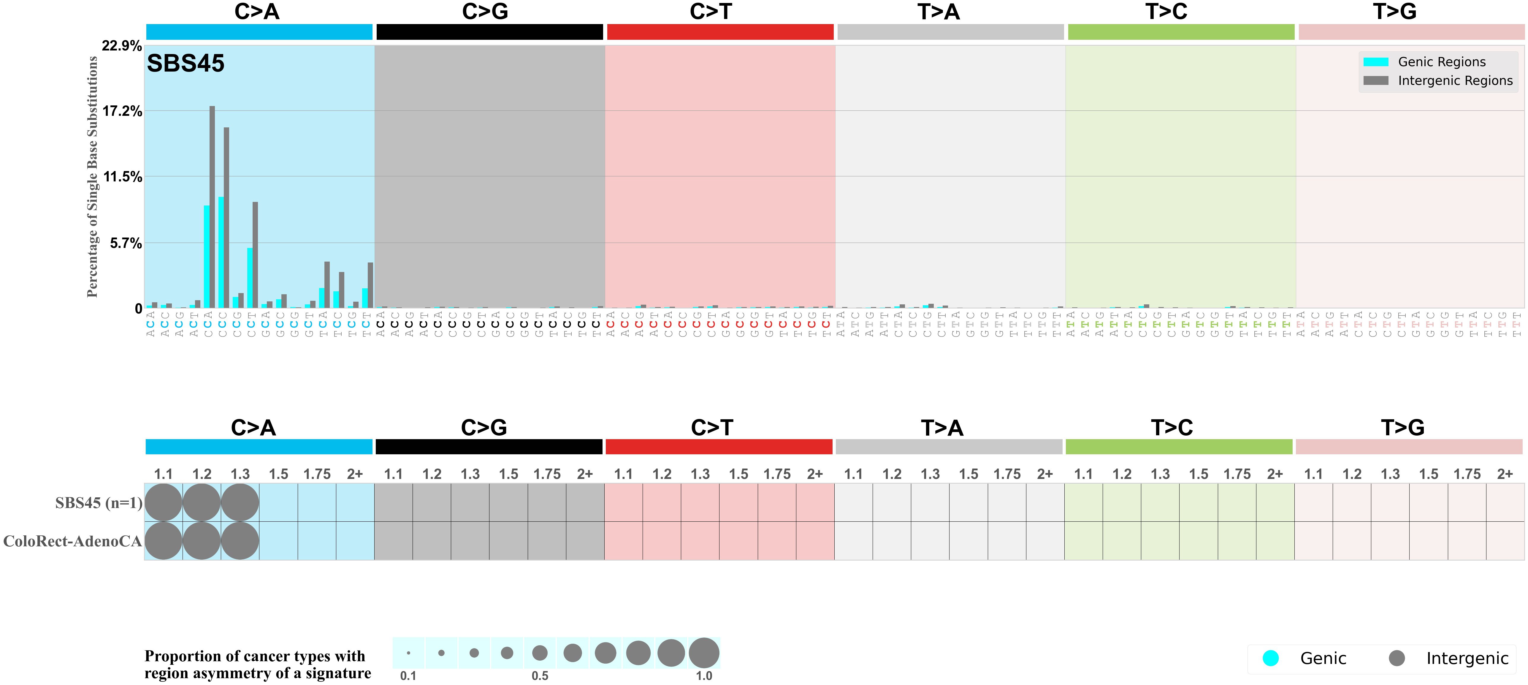 In the lower circle plot, the circles are filled with the colour of the significant region when there is an odds ratio of at least 1.1 with statistical significance. The first row of this plot displays the genic versus intergenic region asymmetry across all cancer types, while the remaining rows present genic versus intergenic region asymmetry for each cancer type.