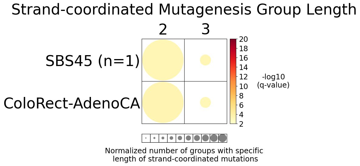 Strand-coordinated mutagenesis analysis identifies groups of consecutive single-base substitutions on the same DNA strand with the same pyrimidine mutation context (e.g., consecutive C>A, C>A, C>A) attributed to the same mutational signature within a sample.