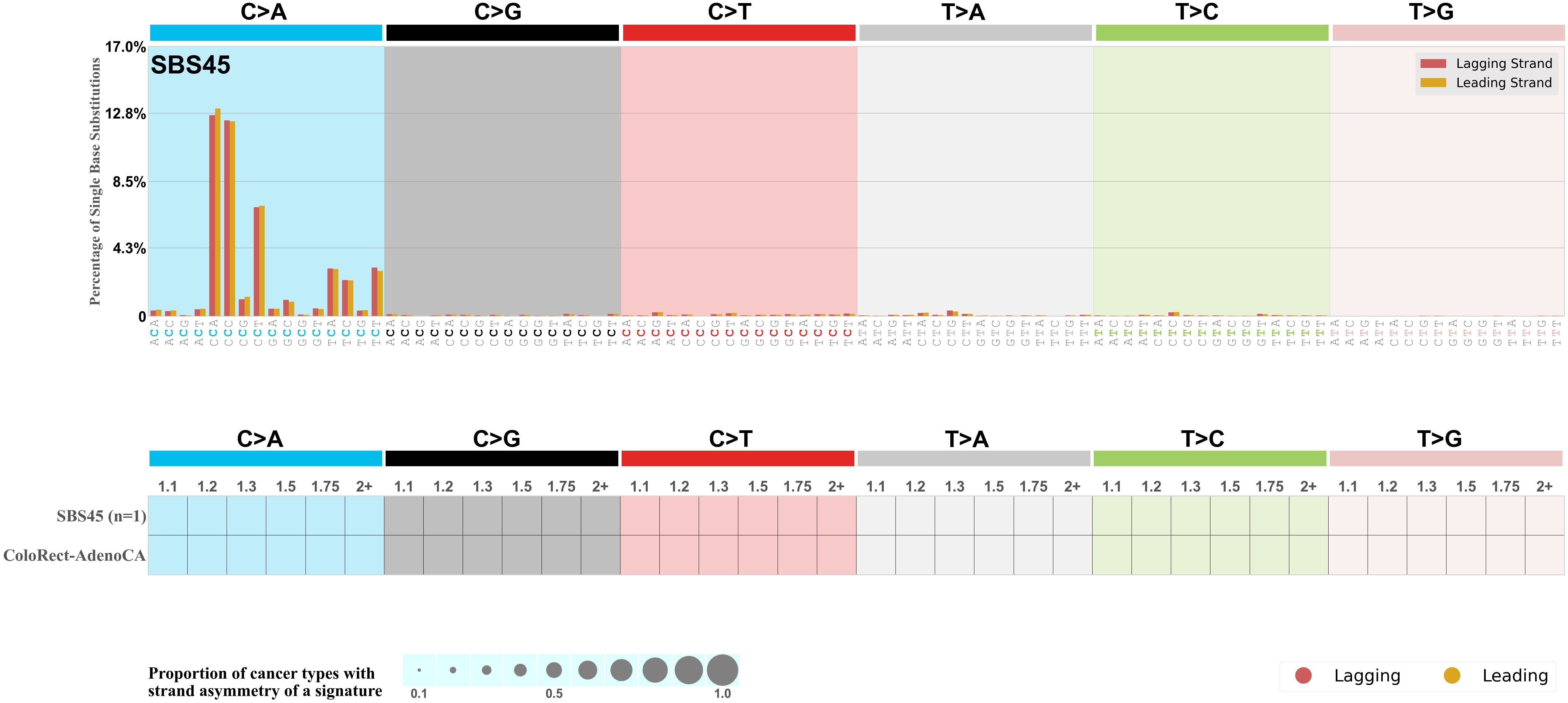 Each mutation attributed to the mutational signature is annotated as either on the lagging strand or the leading strand.