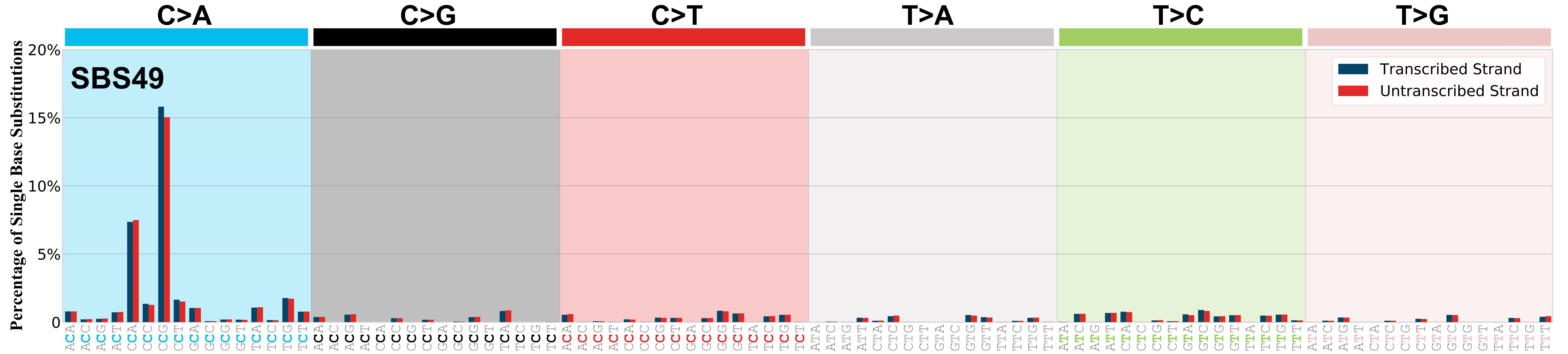 Mutational profile using the conventional 96 mutation type classification. This classification is based on the six substitution subtypes: C>A, C>G, C>T, T>A, T>C, and T>G, as well as the nucleotides immediately 5’ and 3’ to the mutation.