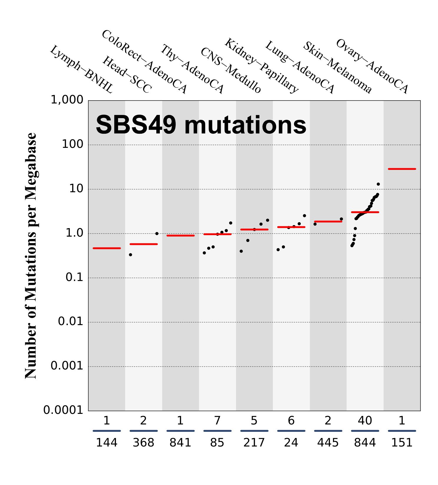 Numbers of mutations per megabase attributed to the mutational signature across the cancer types in which the signature was found. Each dot represents an individual sample and only samples where the signature is found are shown. The number of mutations per megabase was calculated by assuming that an average whole-exome has 30 Mb with sufficient coverage, whereas an average whole-genome has 2,800 Mb with sufficient coverage.