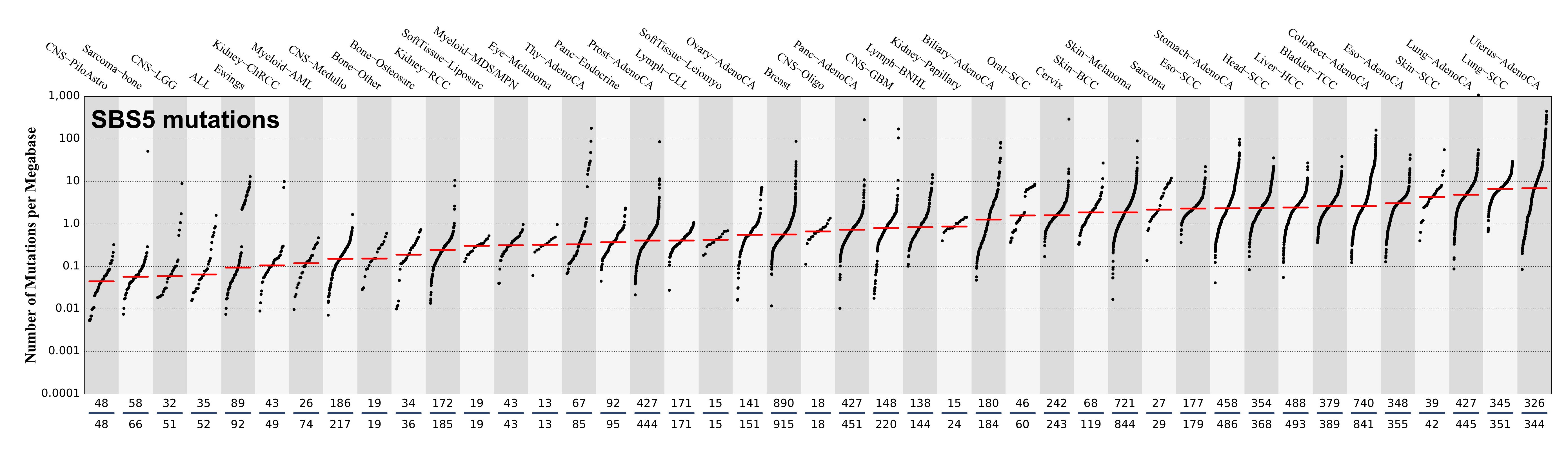 SBS5 is clock-like in that the number of mutations in most cancers and normal cells correlates with the age of the individual. Rates of acquisition of SBS5 mutations over time differ between different cancer types and different normal cell types. These differences do not clearly correlate with estimated rates of stem cell division in different tissues nor with differences in SBS1 mutation rates. SBS5 may be contaminated by SBS16.