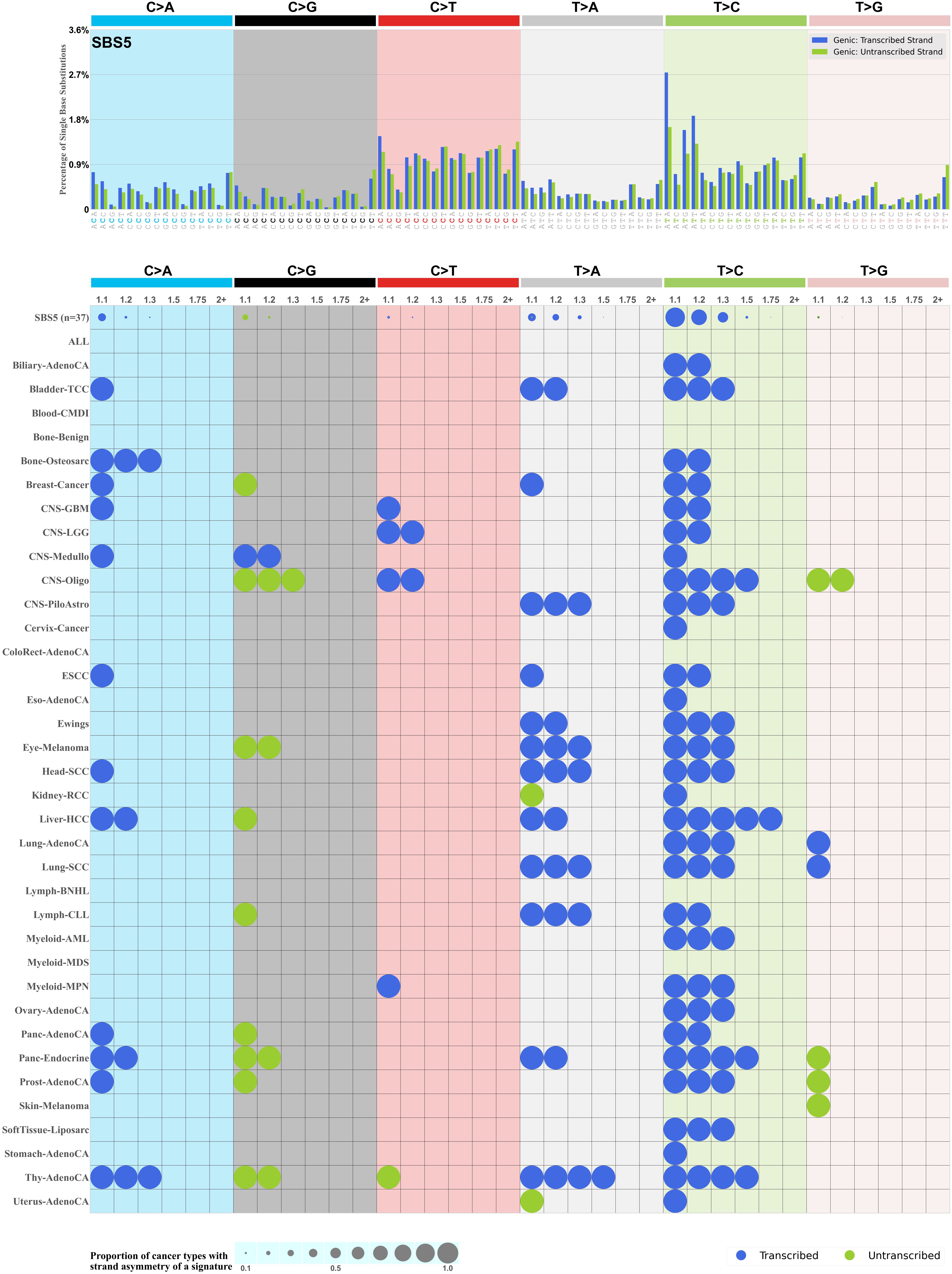 In the lower circle plot, the circles are filled with the colour of the significant strand when there is an odds ratio of at least 1.1 with statistical significance. The first row of this plot displays the transcriptional strand asymmetry across all cancer types, while the remaining rows present transcriptional strand asymmetry for each cancer type.