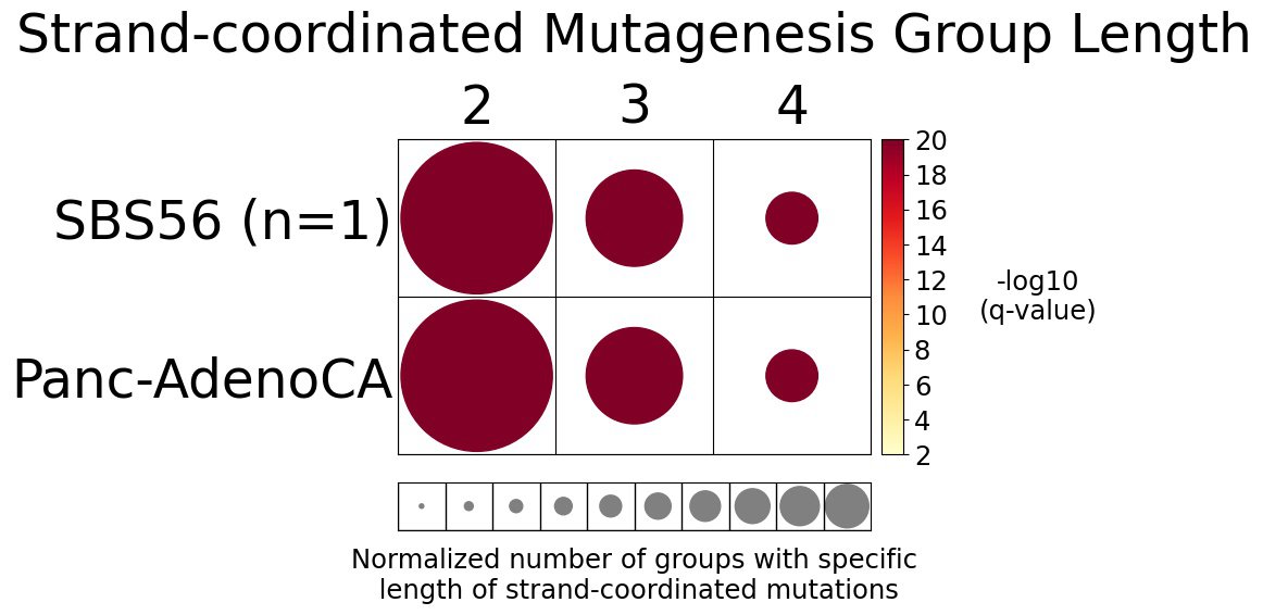 Strand-coordinated mutagenesis analysis identifies groups of consecutive single-base substitutions on the same DNA strand with the same pyrimidine mutation context (e.g., consecutive C>A, C>A, C>A) attributed to the same mutational signature within a sample.