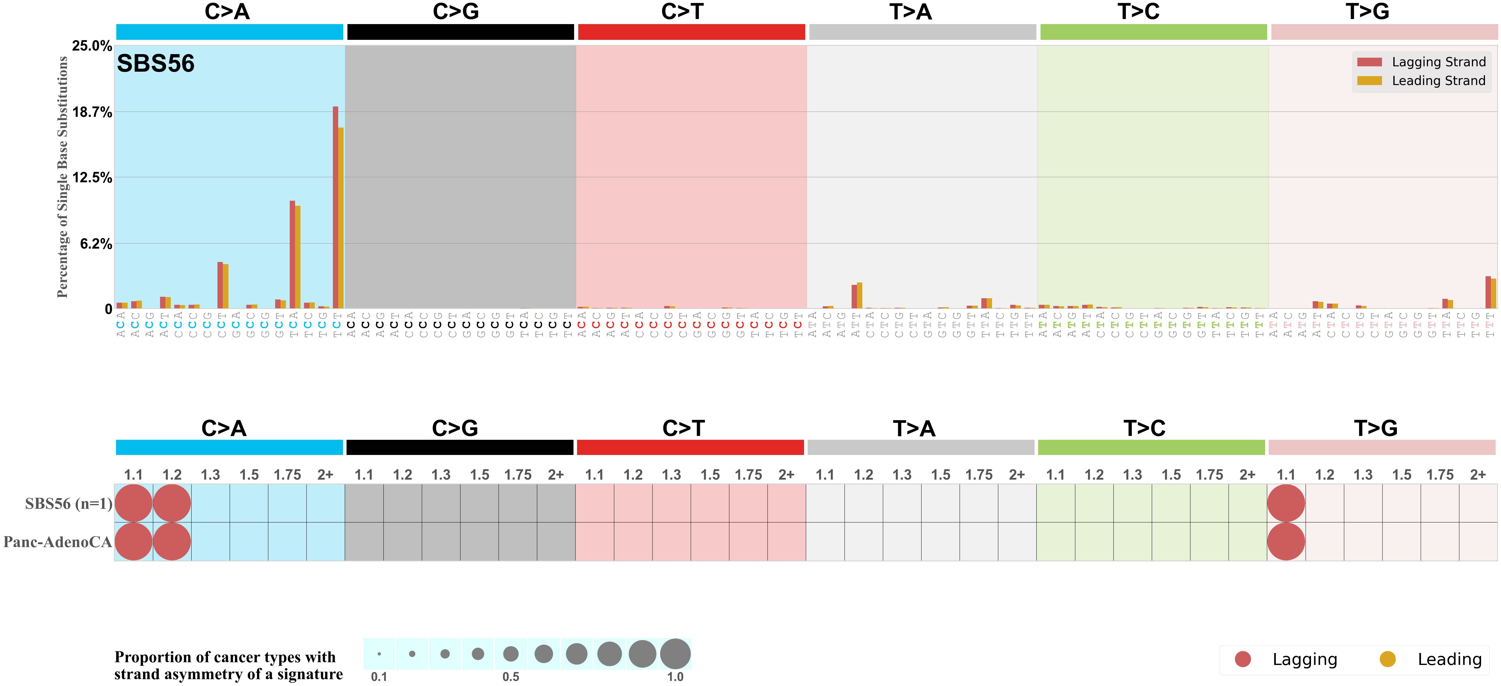 Each mutation attributed to the mutational signature is annotated as either on the lagging strand or the leading strand.