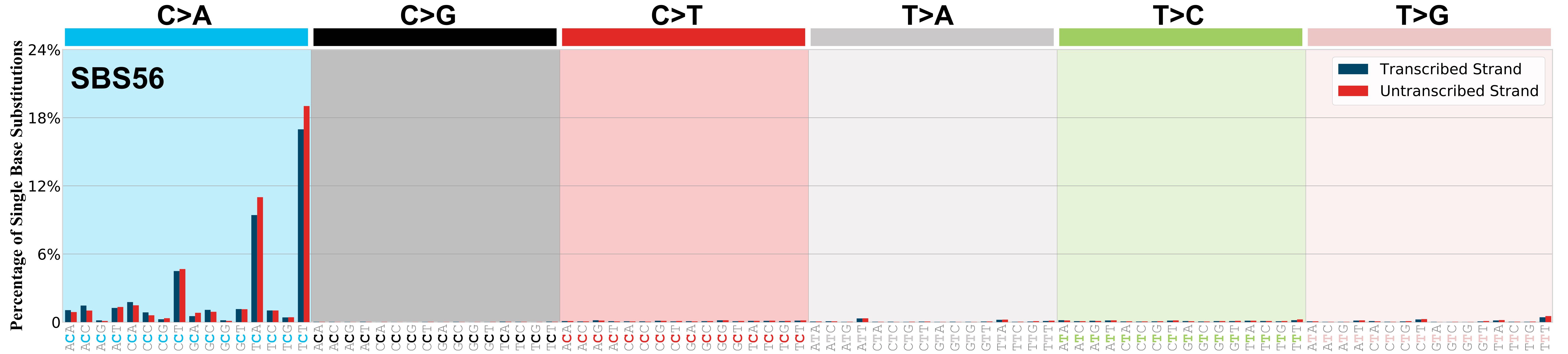 Mutational profile using the conventional 96 mutation type classification. This classification is based on the six substitution subtypes: C>A, C>G, C>T, T>A, T>C, and T>G, as well as the nucleotides immediately 5’ and 3’ to the mutation.