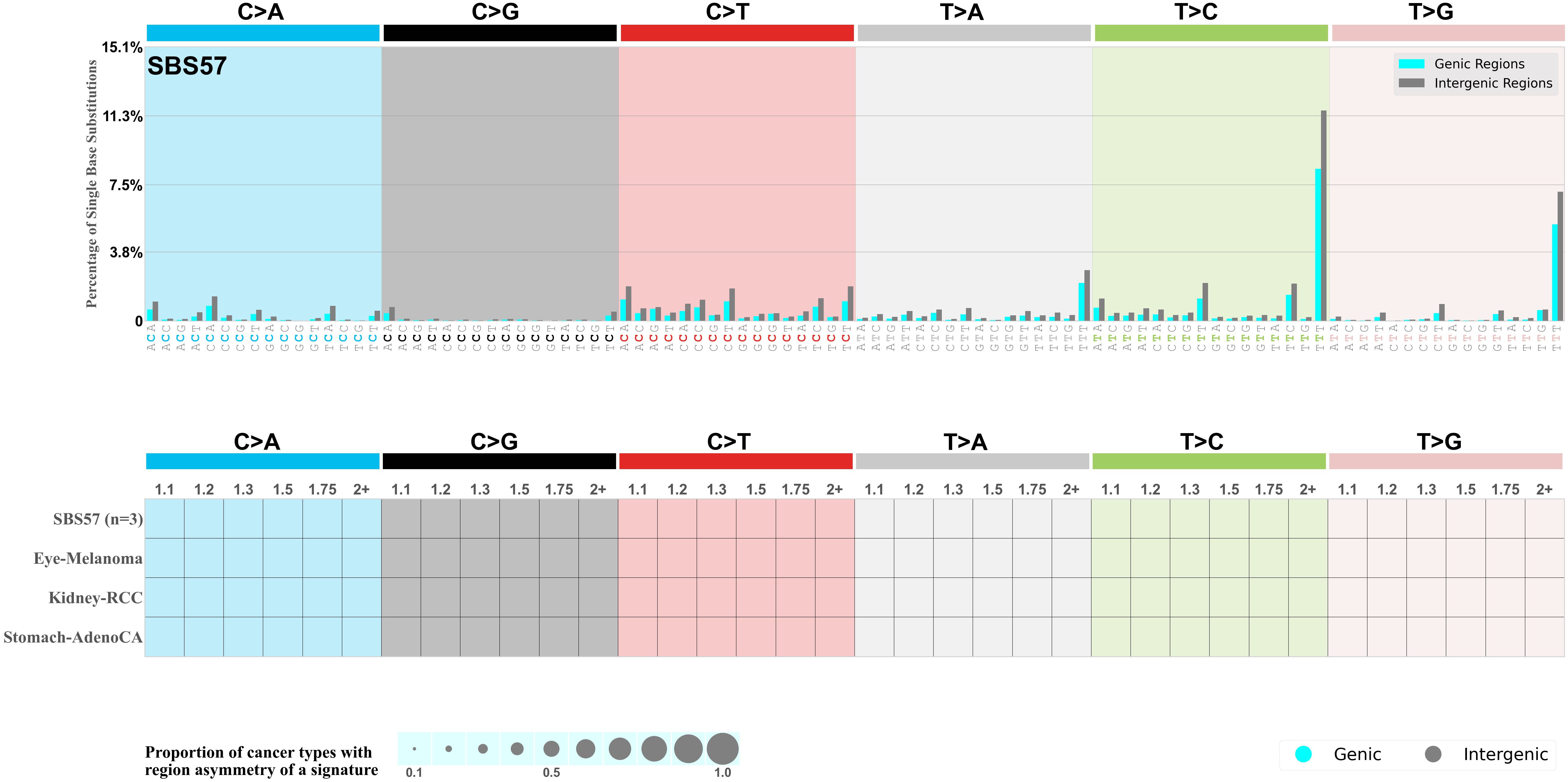 In the lower circle plot, the circles are filled with the colour of the significant region when there is an odds ratio of at least 1.1 with statistical significance. The first row of this plot displays the genic versus intergenic region asymmetry across all cancer types, while the remaining rows present genic versus intergenic region asymmetry for each cancer type.