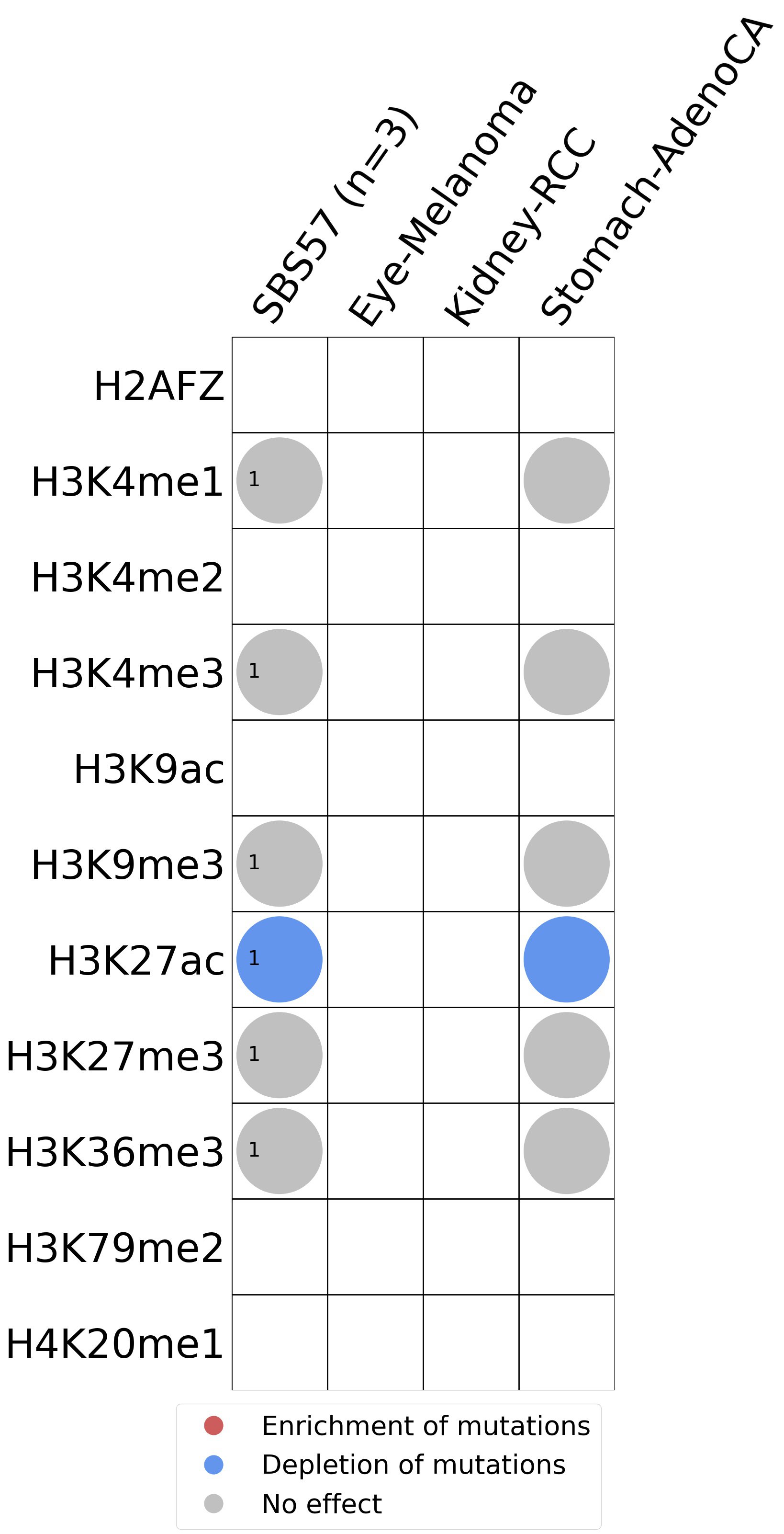 This plot shows the associations between mutational signatures and histone marks. Pie charts display the number of cancer types that are either enriched, depleted, or have no statistical effect for a given mutational signature and a specific histone mark. Differential changes are calculated by statistically comparing the of average signals between real and simulated mutations using a 100 base window centered at the somatic mutation. Enrichments reflect at least 5% statistically significant increases in real signal when compared to simulated signal. Depletions reflect at least 5% statistically significant decreases in real signal when compared to simulated signal. Statistical significance is determined based on false-discovery rate corrected p-value below 0.05.