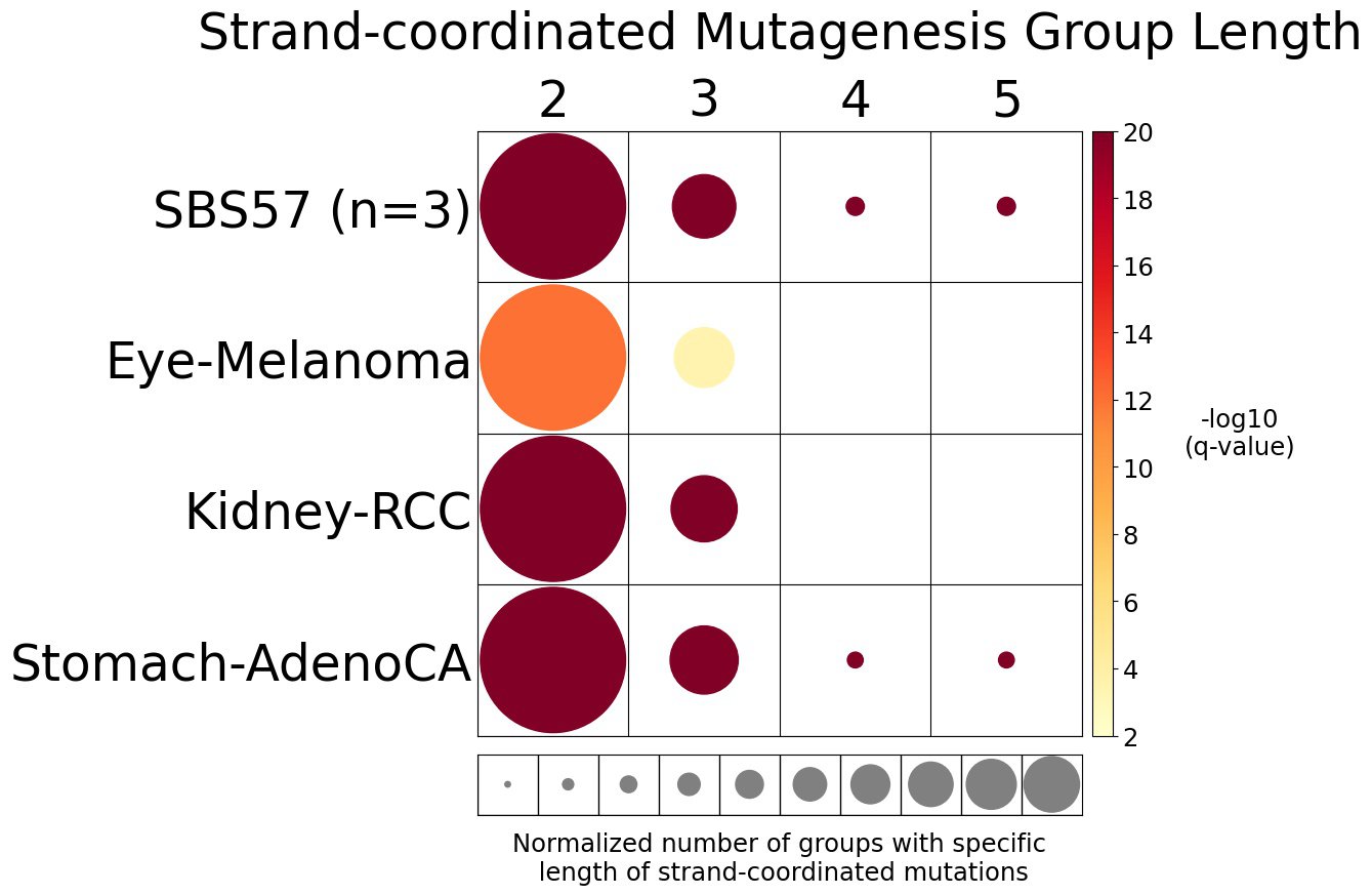 Strand-coordinated mutagenesis analysis identifies groups of consecutive single-base substitutions on the same DNA strand with the same pyrimidine mutation context (e.g., consecutive C>A, C>A, C>A) attributed to the same mutational signature within a sample.