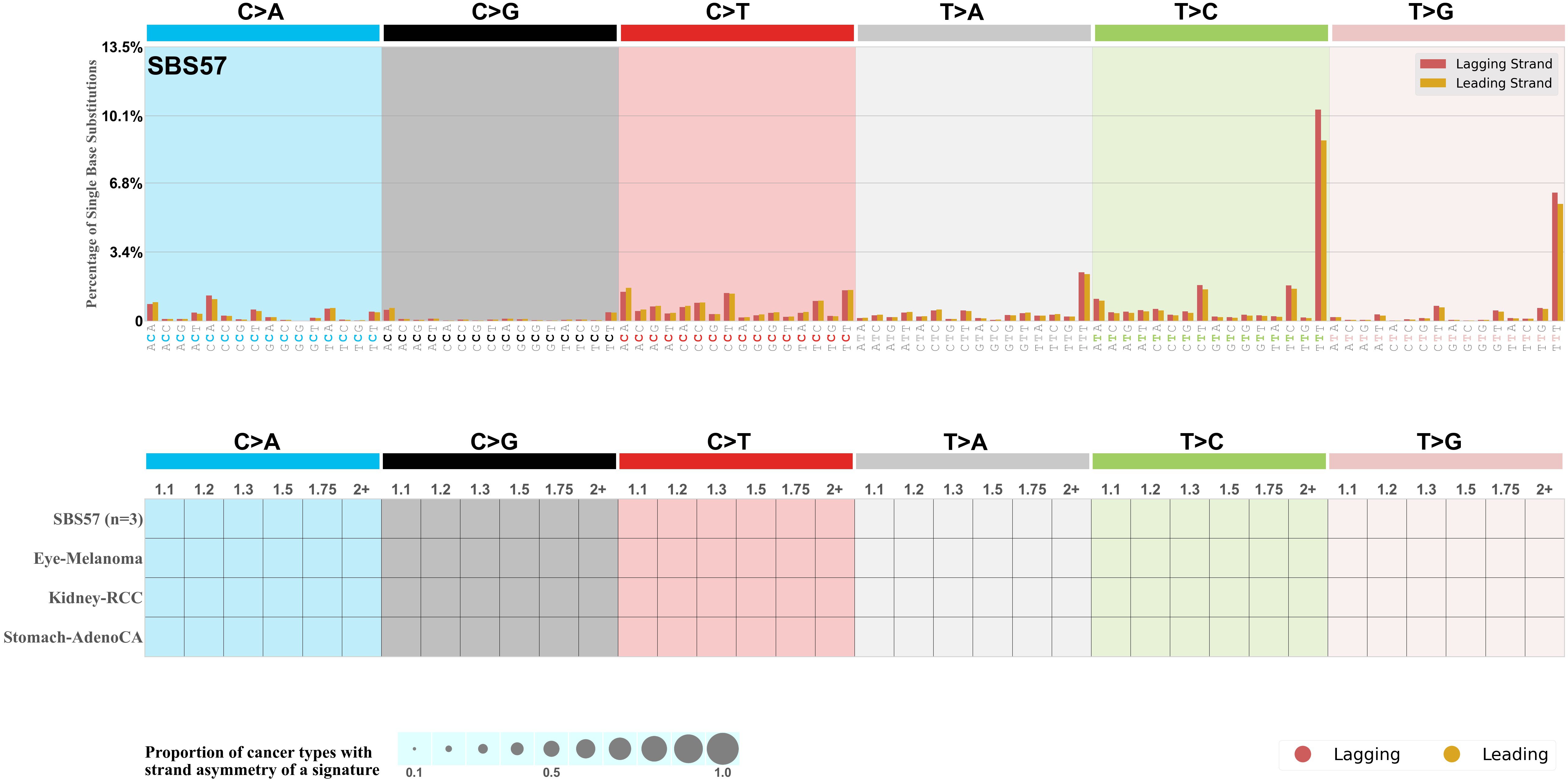 Each mutation attributed to the mutational signature is annotated as either on the lagging strand or the leading strand.