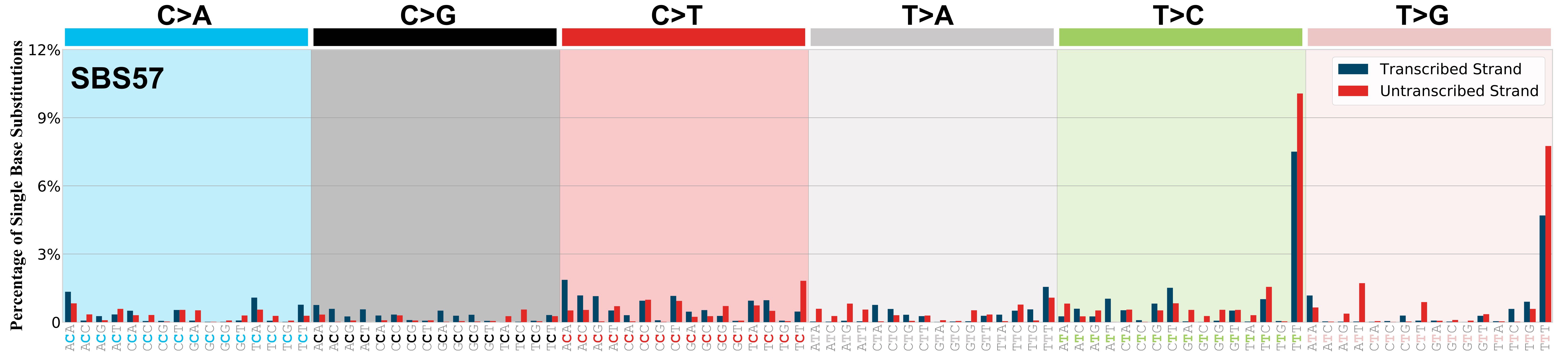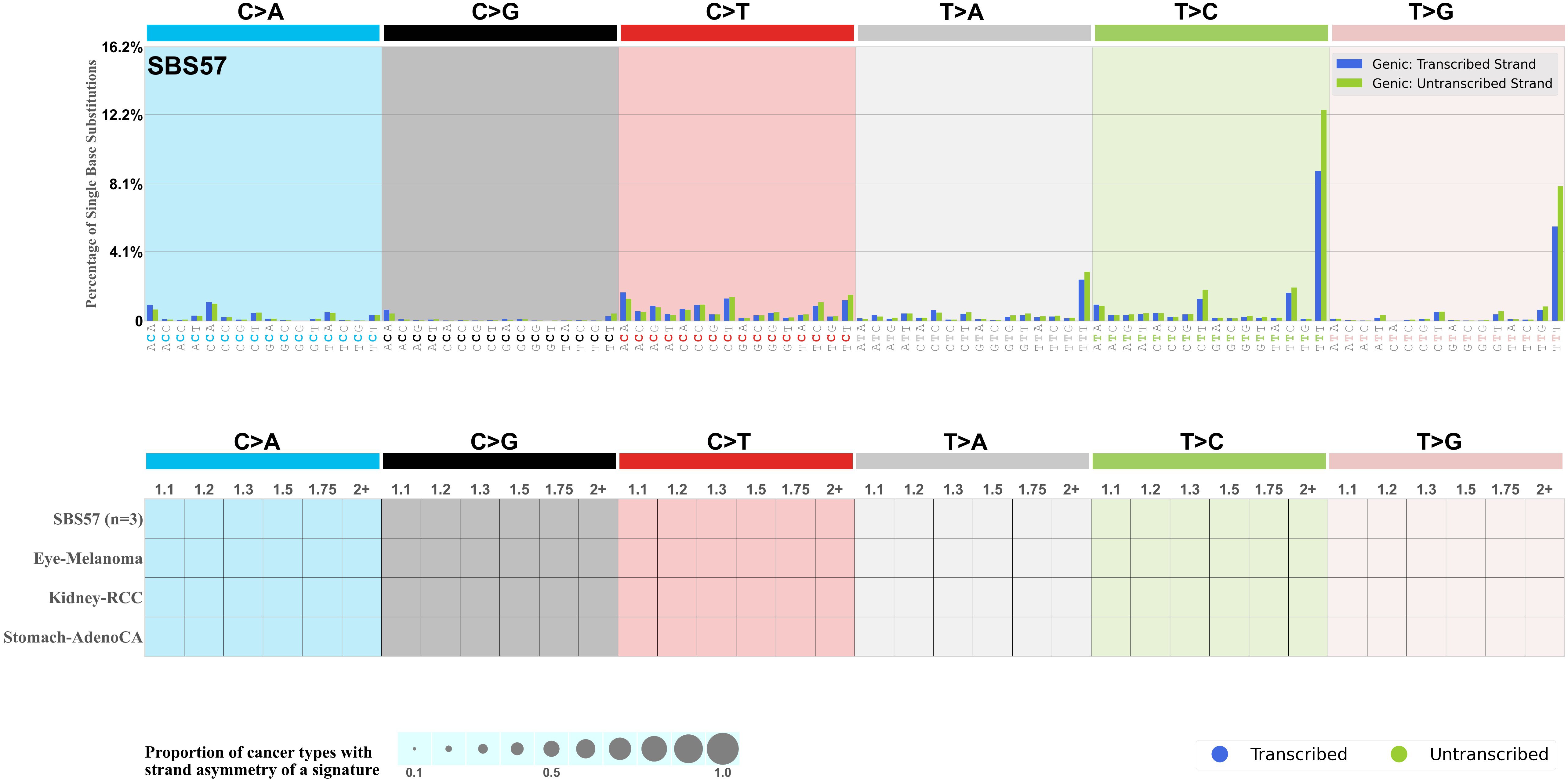 Mutational signatures exhibit asymmetric number of mutations due to either one of the DNA strands being preferentially repaired or one of the DNA strands having a higher propensity for being damaged. One common example of strand asymmetry is transcription-strand asymmetry which can be due to the activity of transcription-coupled nucleotide excision repair (TC-NER) or transcription-coupled damage amongst others.