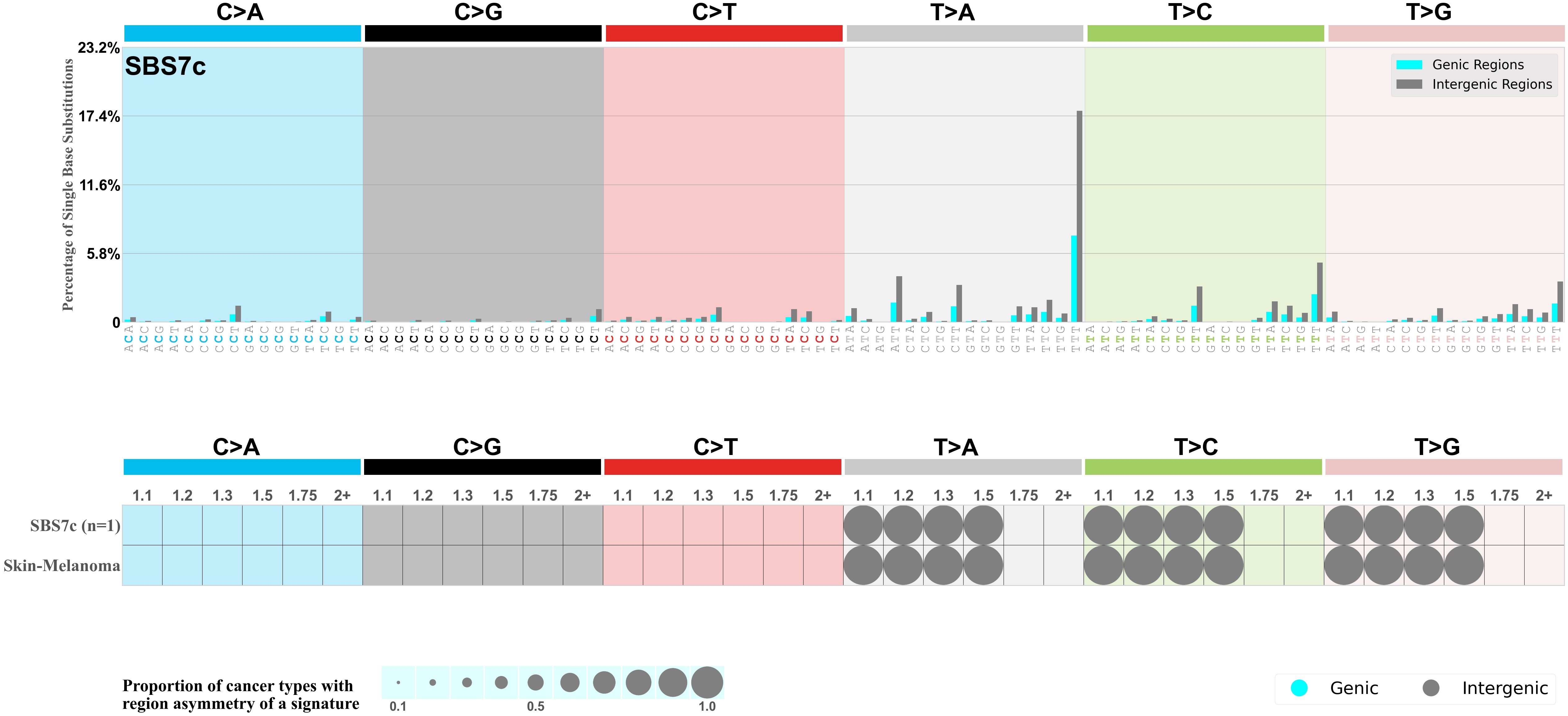 Mutational signatures exhibit asymmetric number of mutations due to either one of the DNA strands being preferentially repaired or one of the DNA strands having a higher propensity for being damaged. One common example of strand asymmetry is transcription-strand asymmetry which can be due to the activity of transcription-coupled nucleotide excision repair (TC-NER) or transcription-coupled damage amongst others.