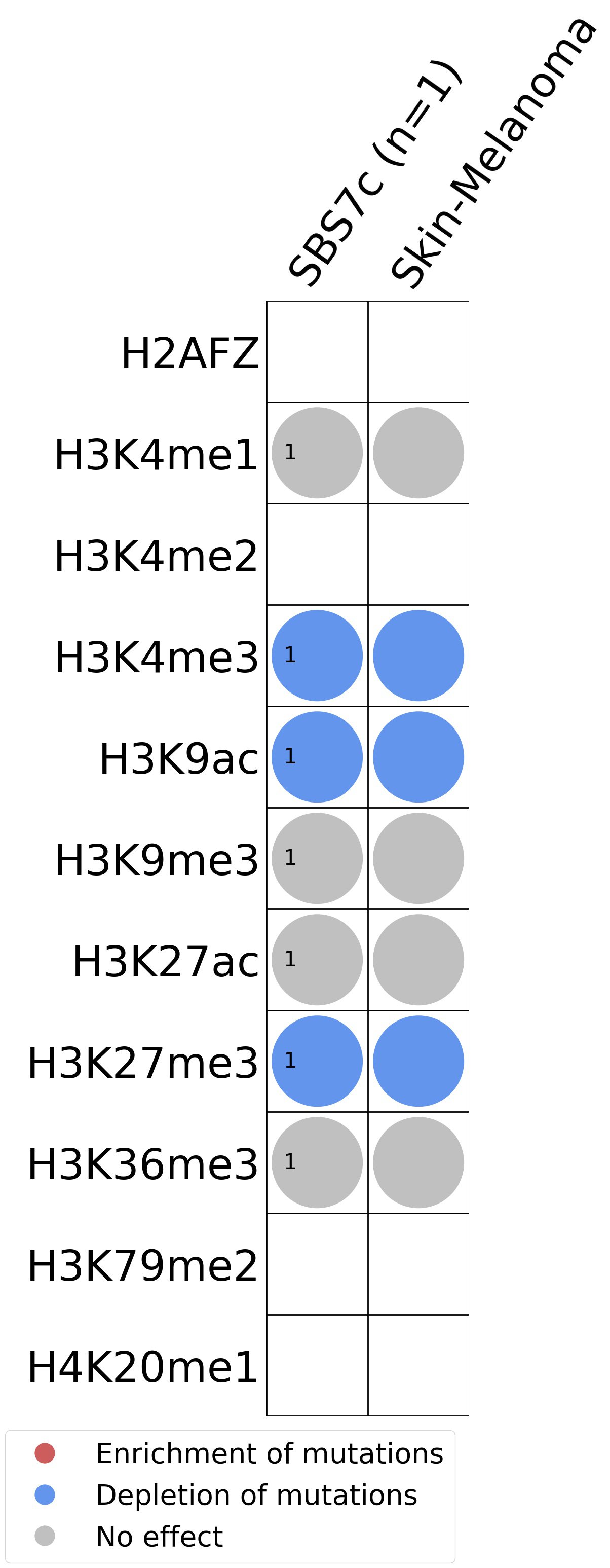 This plot shows the associations between mutational signatures and histone marks. Pie charts display the number of cancer types that are either enriched, depleted, or have no statistical effect for a given mutational signature and a specific histone mark. Differential changes are calculated by statistically comparing the of average signals between real and simulated mutations using a 100 base window centered at the somatic mutation. Enrichments reflect at least 5% statistically significant increases in real signal when compared to simulated signal. Depletions reflect at least 5% statistically significant decreases in real signal when compared to simulated signal. Statistical significance is determined based on false-discovery rate corrected p-value below 0.05.