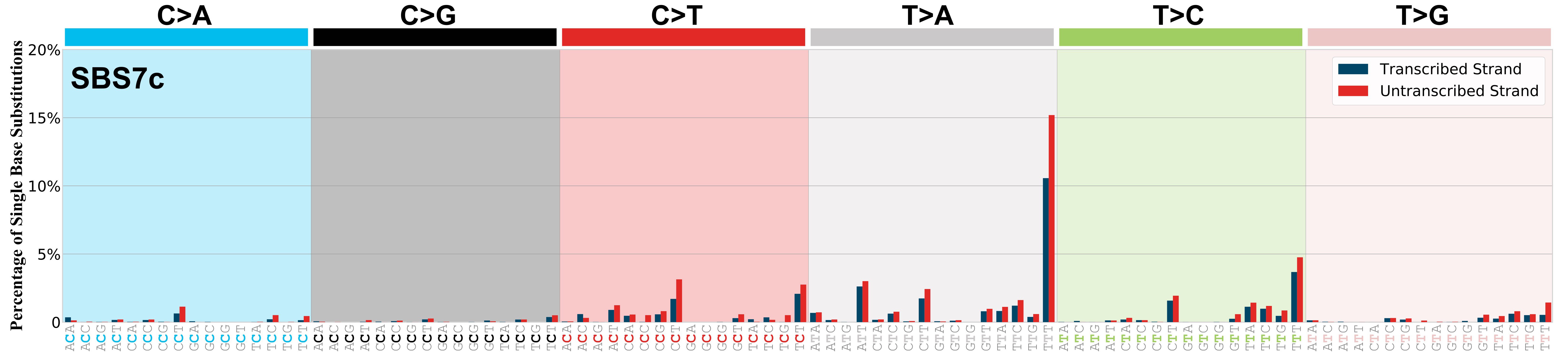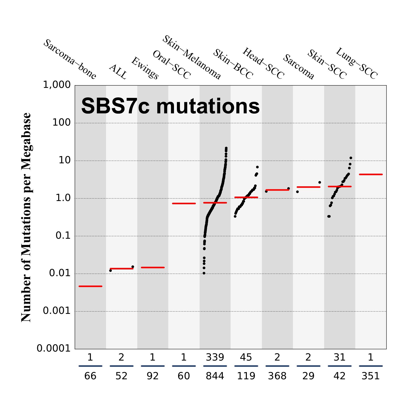SBS7a/SBS7b/SBS7c/SBS7d are found in cancers of the skin from sun exposed areas and are likely to be due to exposure to ultraviolet light. SBS7c is possibly the consequence of translesion DNA synthesis by enzymes with propensity to insert T, rather than A, opposite ultraviolet induced thymidine and cytidine photodimers. The preponderance of T>A rather than T>C mutations may reflect the heavier burden of thymidine compared to cytidine dimers induced by UV light.