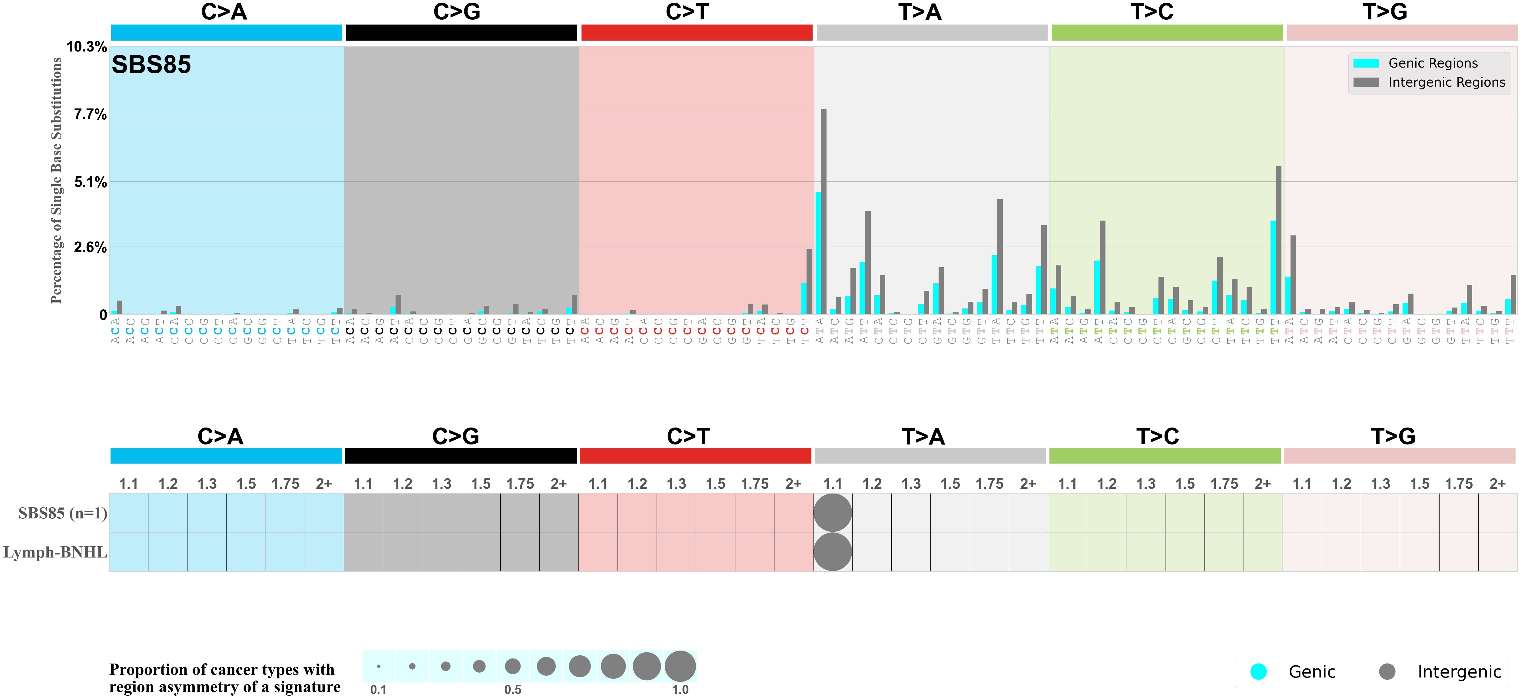 SBS85 is found in clustered mutations in the immunoglobulin gene and other regions in lymphoid cancers.