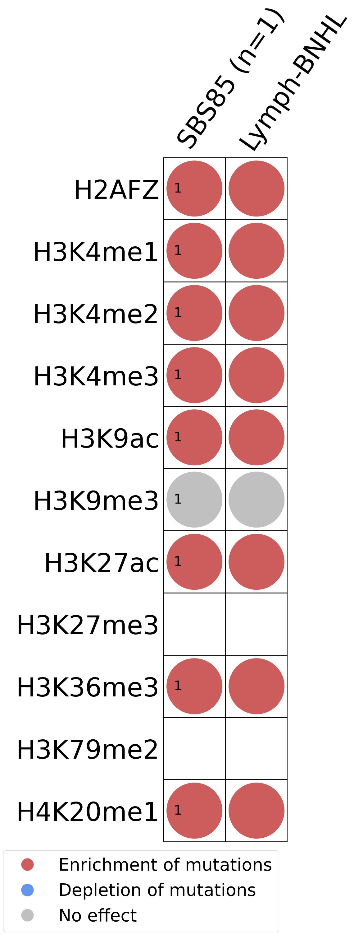 This plot shows the associations between mutational signatures and histone marks. Pie charts display the number of cancer types that are either enriched, depleted, or have no statistical effect for a given mutational signature and a specific histone mark. Differential changes are calculated by statistically comparing the of average signals between real and simulated mutations using a 100 base window centered at the somatic mutation. Enrichments reflect at least 5% statistically significant increases in real signal when compared to simulated signal. Depletions reflect at least 5% statistically significant decreases in real signal when compared to simulated signal. Statistical significance is determined based on false-discovery rate corrected p-value below 0.05.