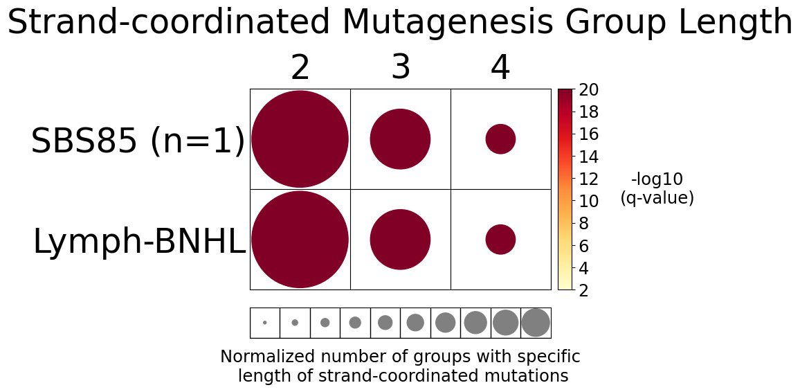 Strand-coordinated mutagenesis analysis identifies groups of consecutive single-base substitutions on the same DNA strand with the same pyrimidine mutation context (e.g., consecutive C>A, C>A, C>A) attributed to the same mutational signature within a sample.