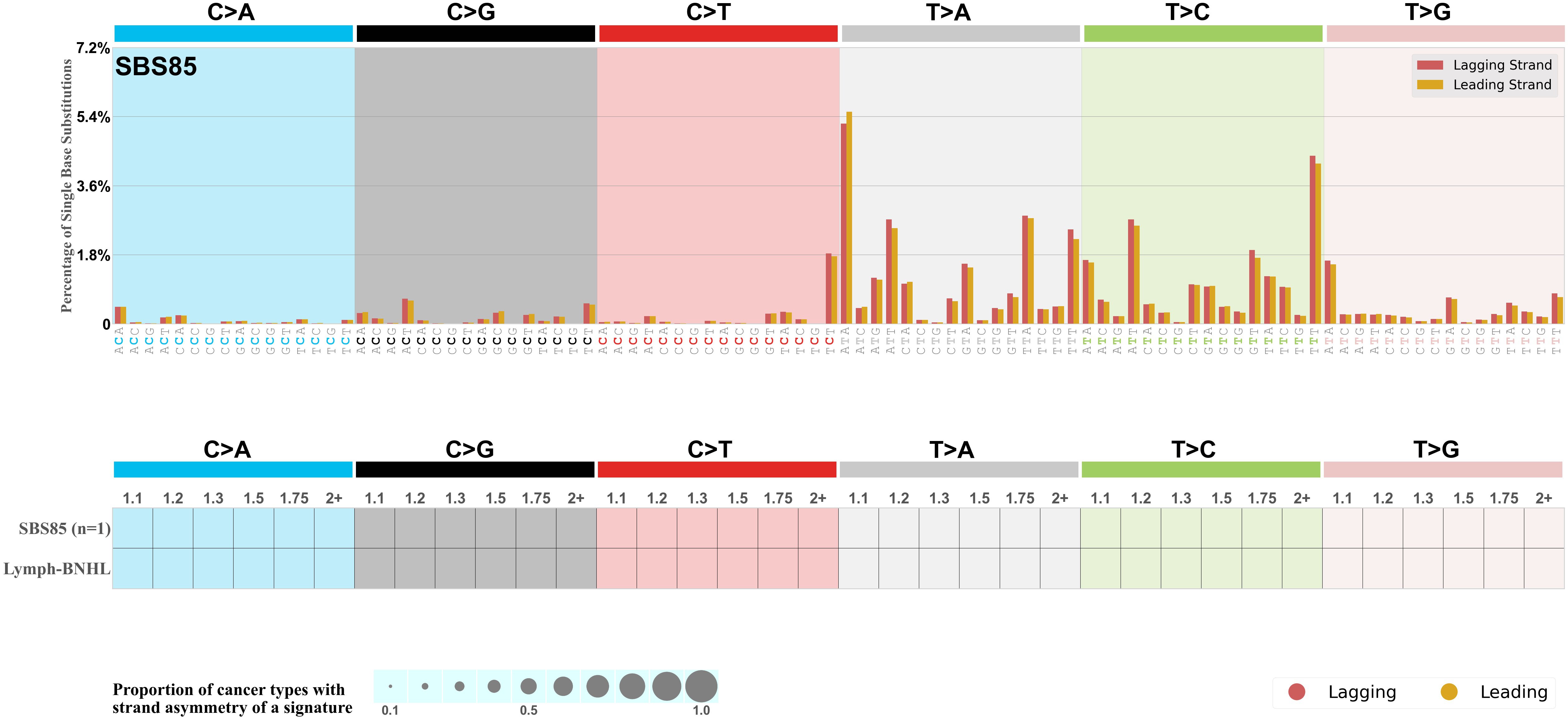 Each mutation attributed to the mutational signature is annotated as either on the lagging strand or the leading strand.