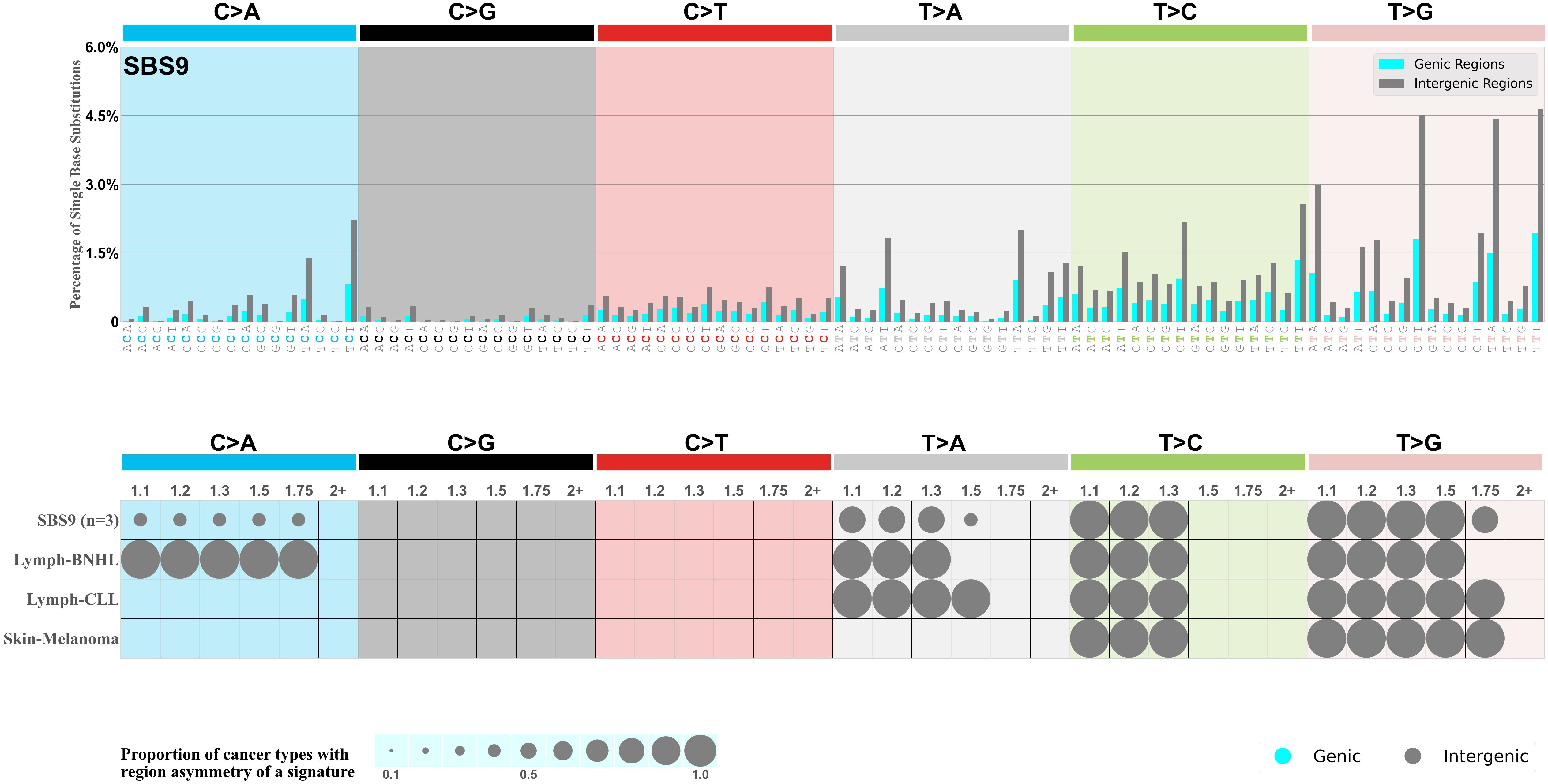 Mutational signatures exhibit asymmetric number of mutations due to either one of the DNA strands being preferentially repaired or one of the DNA strands having a higher propensity for being damaged. One common example of strand asymmetry is transcription-strand asymmetry which can be due to the activity of transcription-coupled nucleotide excision repair (TC-NER) or transcription-coupled damage amongst others.