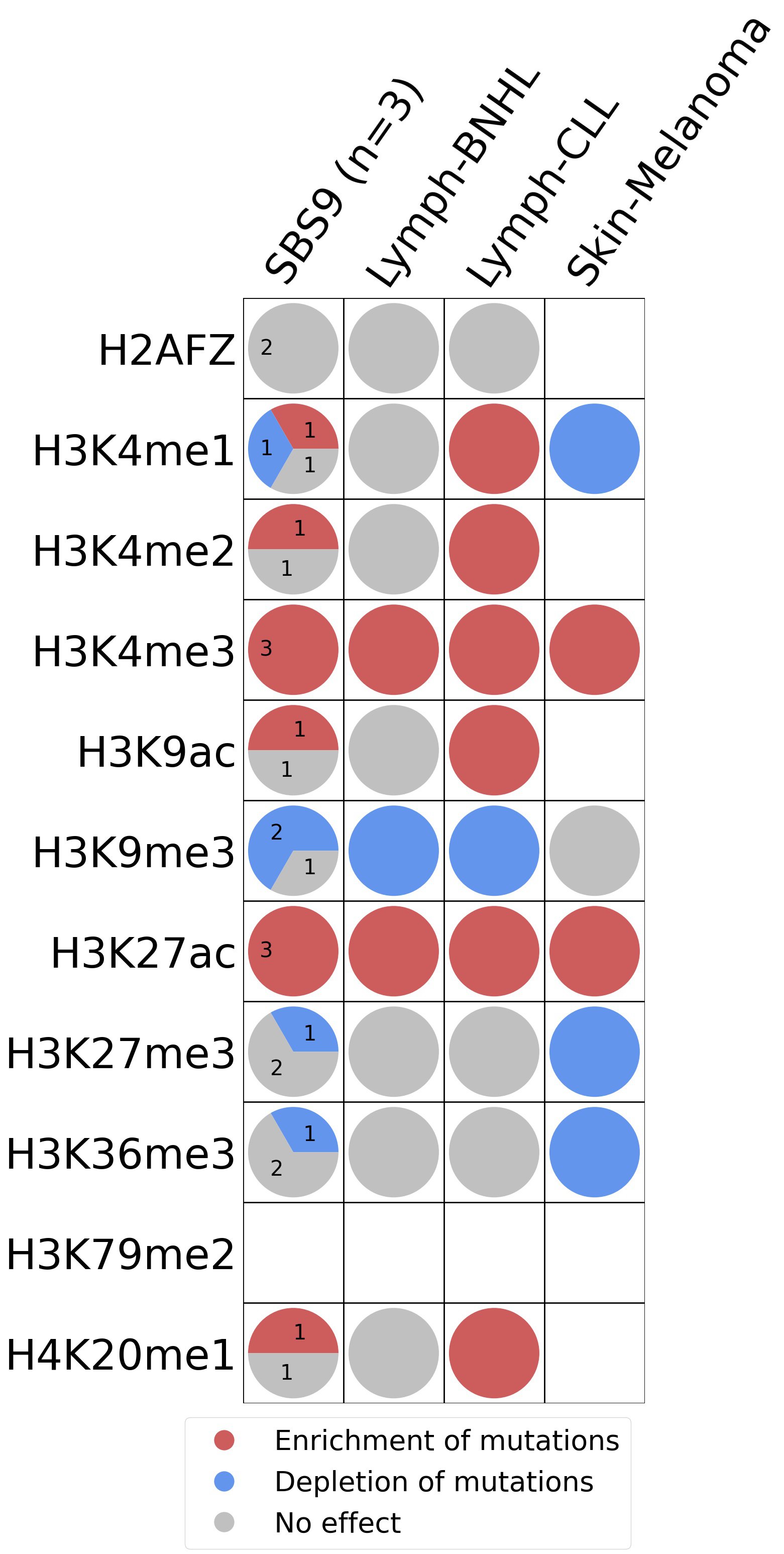 This plot shows the associations between mutational signatures and histone marks. Pie charts display the number of cancer types that are either enriched, depleted, or have no statistical effect for a given mutational signature and a specific histone mark. Differential changes are calculated by statistically comparing the of average signals between real and simulated mutations using a 100 base window centered at the somatic mutation. Enrichments reflect at least 5% statistically significant increases in real signal when compared to simulated signal. Depletions reflect at least 5% statistically significant decreases in real signal when compared to simulated signal. Statistical significance is determined based on false-discovery rate corrected p-value below 0.05.