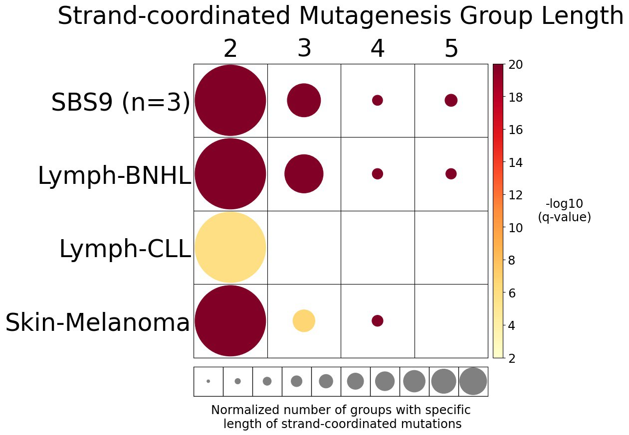 Strand-coordinated mutagenesis analysis identifies groups of consecutive single-base substitutions on the same DNA strand with the same pyrimidine mutation context (e.g., consecutive C>A, C>A, C>A) attributed to the same mutational signature within a sample.