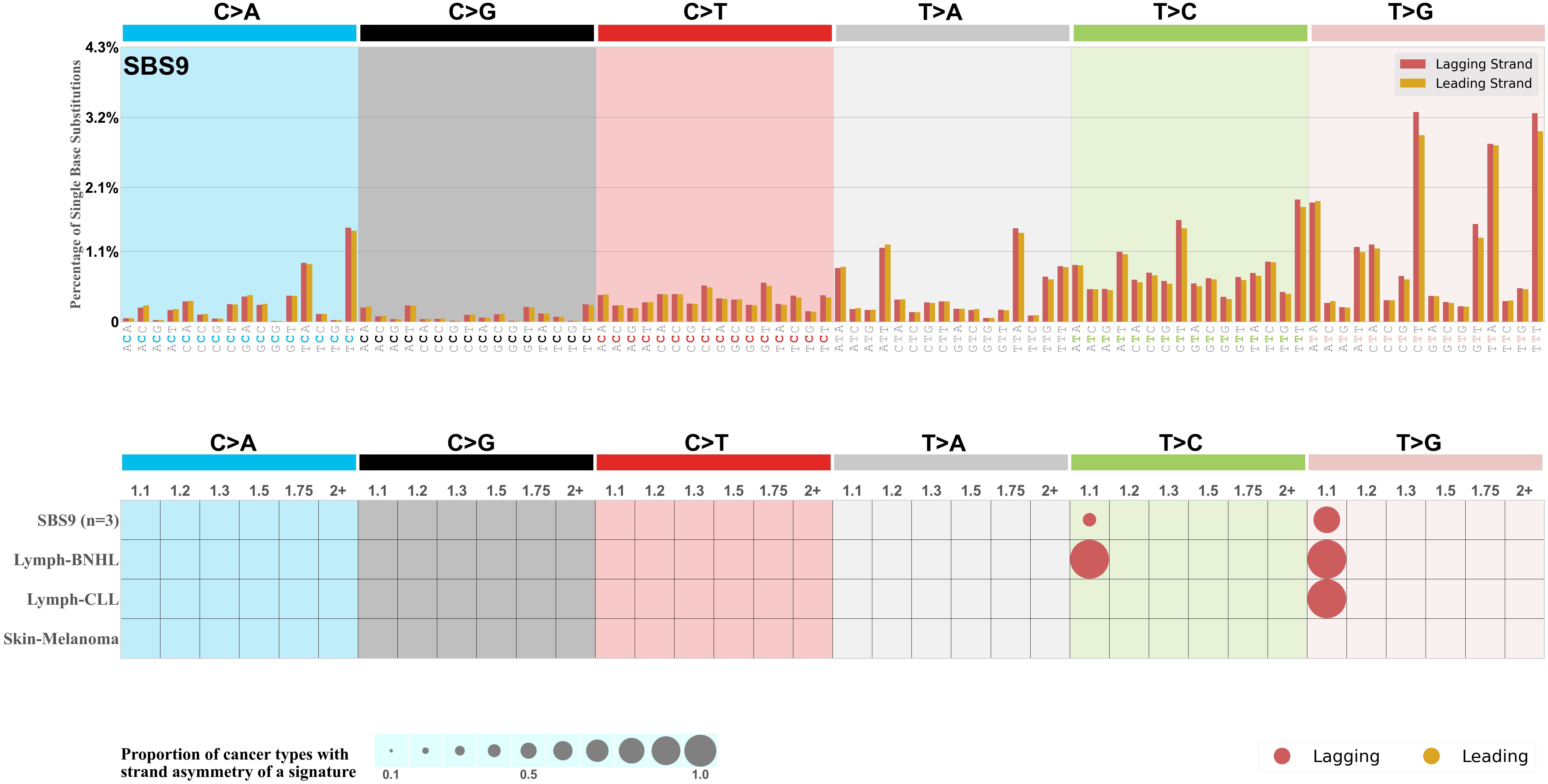 Mutational signatures exhibit asymmetric number of mutations due to either one of the DNA strands being preferentially repaired or one of the DNA strands having a higher propensity for being damaged. One common example of strand asymmetry is replication-strand asymmetry in which the DNA replication process may result in preferential mutagenesis of one of the strands.