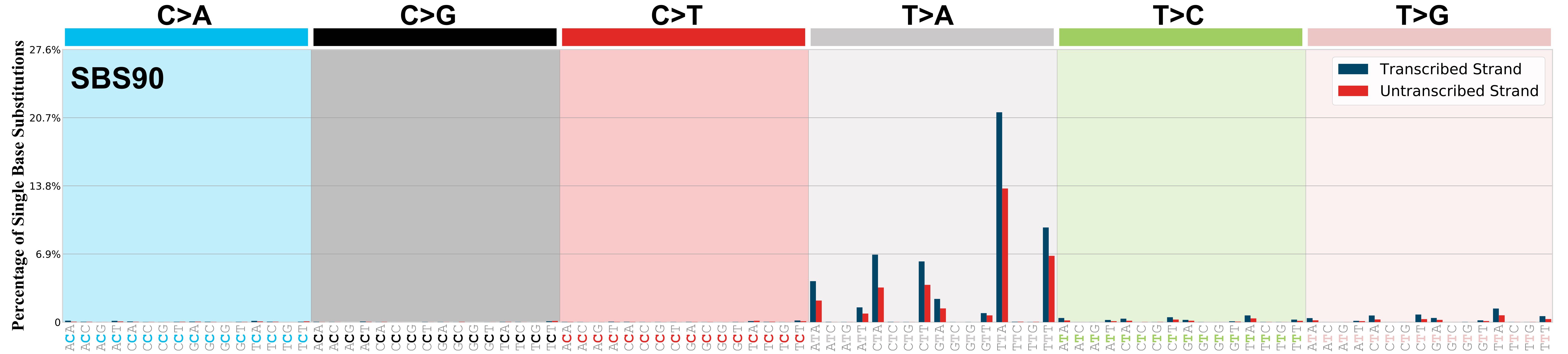 Mutational profile using the conventional 96 mutation type classification. This classification is based on the six substitution subtypes: C>A, C>G, C>T, T>A, T>C, and T>G, as well as the nucleotides immediately 5’ and 3’ to the mutation.